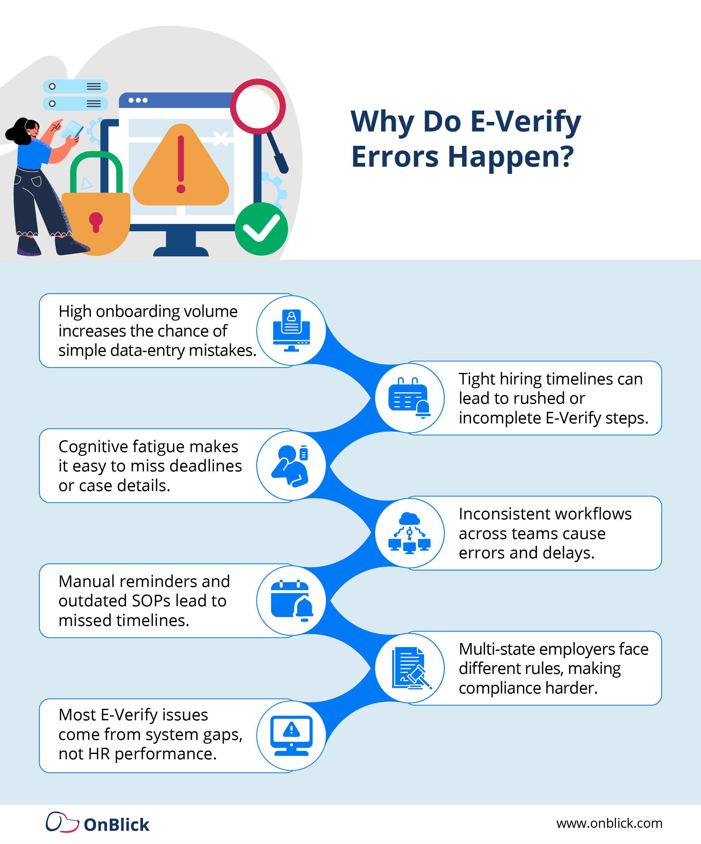 Psychological loads also play a significant role. Onboarding requires a series of time-bound decisions that must be executed flawlessly, and this constant responsibility can lead to cognitive fatigue. HR professionals may rush through data entry to keep processes moving or interpret TNC guidance incorrectly because of pressure from managers eager to onboard a candidate quickly. In hybrid and multi-location teams, inconsistent processes or communication gaps further increase the likelihood of errors in E-Verify or e verify verification steps.