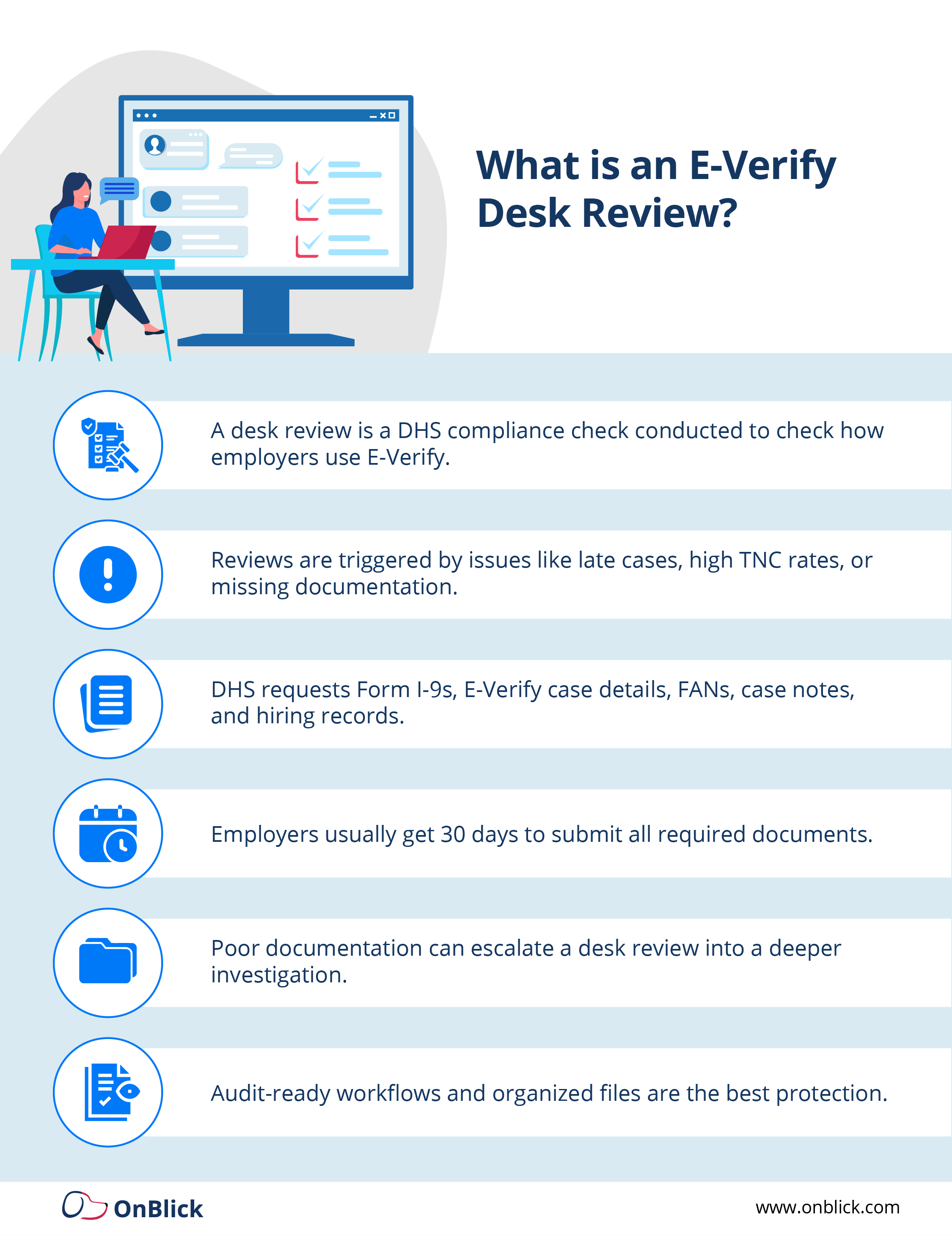 Desk reviews are commonly triggered when DHS notices patterns such as late case creation, an unusually high rate of TNCs, missing case closures, or inconsistent case notes. At times, they are also initiated as part of routine monitoring of employers enrolled in E-Verify. Once selected, employers receive a Request for Information listing the documents DHS needs to assess compliance. For an e-verify employer, this is where the quality of your verification records becomes immediately visible.
