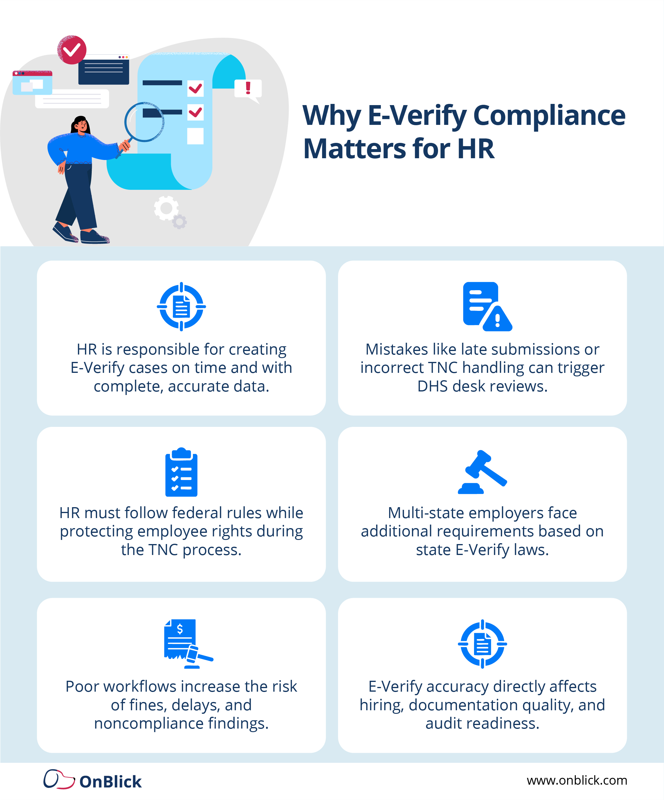 For HR teams, E-Verify is far more than an administrative afterthought. It serves as a critical compliance checkpoint that directly impacts hiring timelines, documentation quality, and an employer’s risk exposure. As federal and state regulators increase oversight, even small errors, such as late case creation or incorrect TNC handling, can trigger follow-up reviews, desk audits, or notices of noncompliance. This makes E-Verify accuracy a core responsibility for HR, not merely a procedural requirement. For every e-verify employer, maintaining control over verification steps is now a strategic necessity.