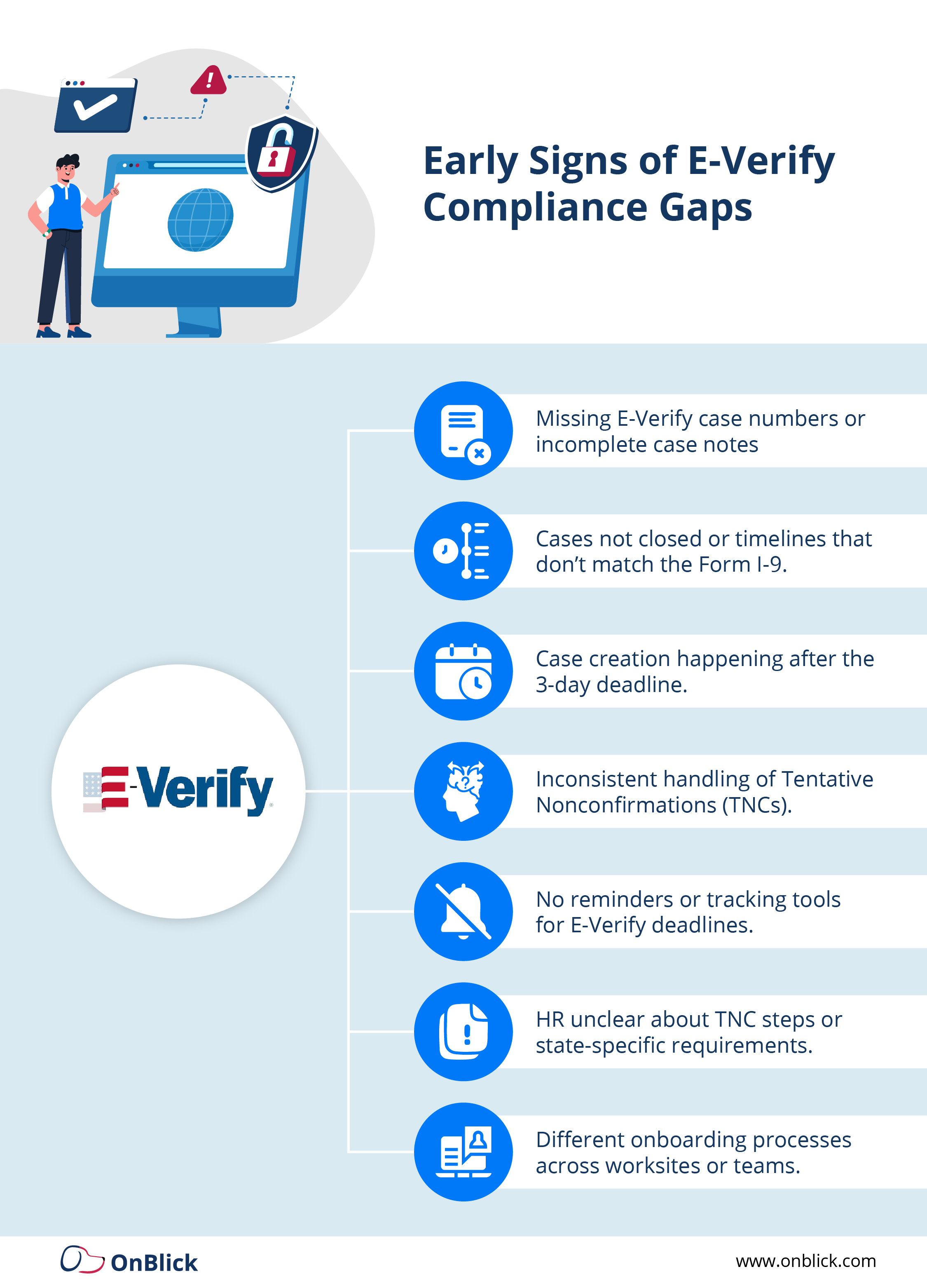 E-Verify compliance issues rarely appear all at once. They tend to surface through small, recurring patterns that gradually weaken the employer’s audit readiness. For HR teams working in fast-paced onboarding environments, these signs can be easy to overlook, especially when E-Verify responsibilities are split across multiple people or locations. Identifying early red flags is essential to prevent minor issues from escalating into DHS findings during a desk review or audit.