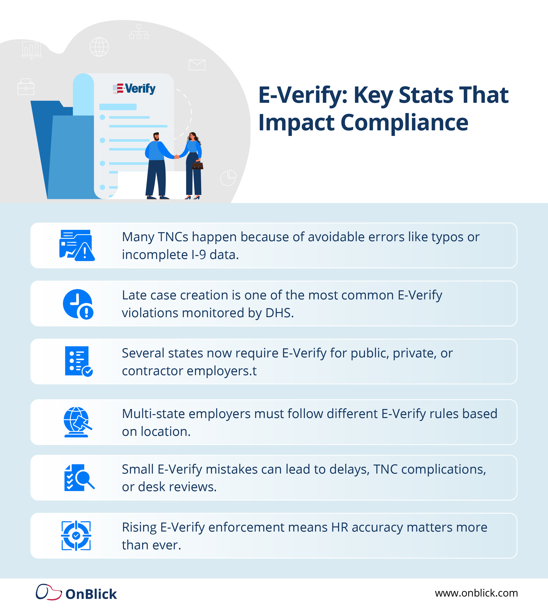 Recent trends show that a significant portion of Tentative Nonconfirmations stem from preventable, HR-controlled issues, such as name mismatches, incorrect dates of birth, or missing Form I-9 fields. These data-entry errors, though simple, account for many of the delays and case complications that trigger follow-up reviews. DHS has also reported rising concerns around late case creation, which remains one of the most common and easily detectable compliance violations in E-Verify and everify usage.