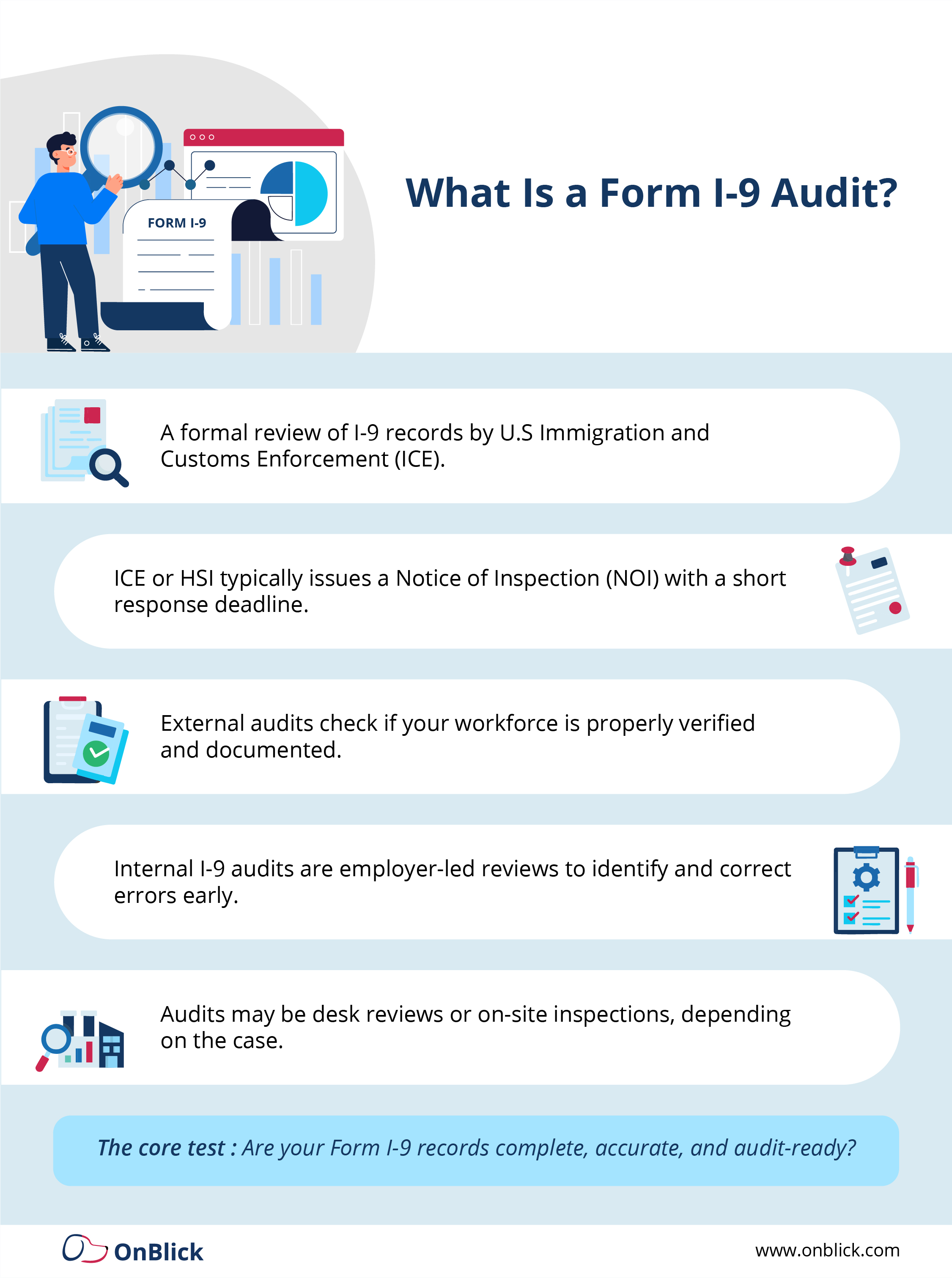 A form i 9 audit is a formal review of your employment eligibility verification records to confirm that your organization is completing and maintaining Form I-9 correctly for every employee. In most cases, these external reviews are conducted by Immigration and Customs Enforcement through its investigative arm Homeland Security Investigations. Many HR teams simply refer to this as an ICE audit or ICE i 9 audit. In some situations the Department of Justice or other agencies may also review I-9 practices.