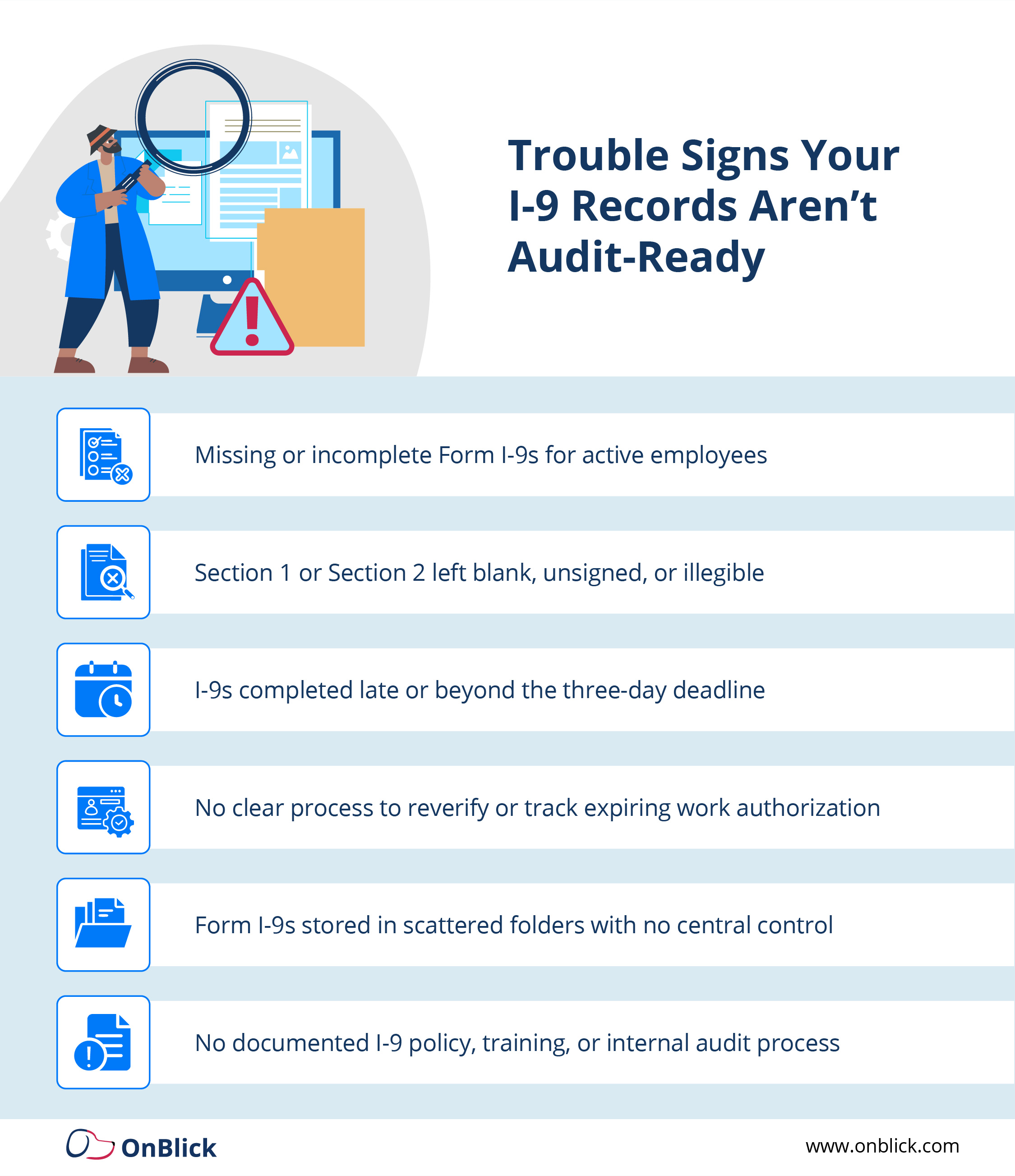 One clear warning sign is missing or incomplete paperwork. If you cannot quickly produce a Form I-9 for every active employee in scope, or if large numbers of forms have blank fields, missing signatures, or illegible information, your records are not audit-ready. Another common issue is timing: Forms I-9 completed late, Section 2 signed more than three business days after the hire date, or reverification done after work authorization expires. These errors are easy for auditors to detect in an i9 audit and difficult to defend.