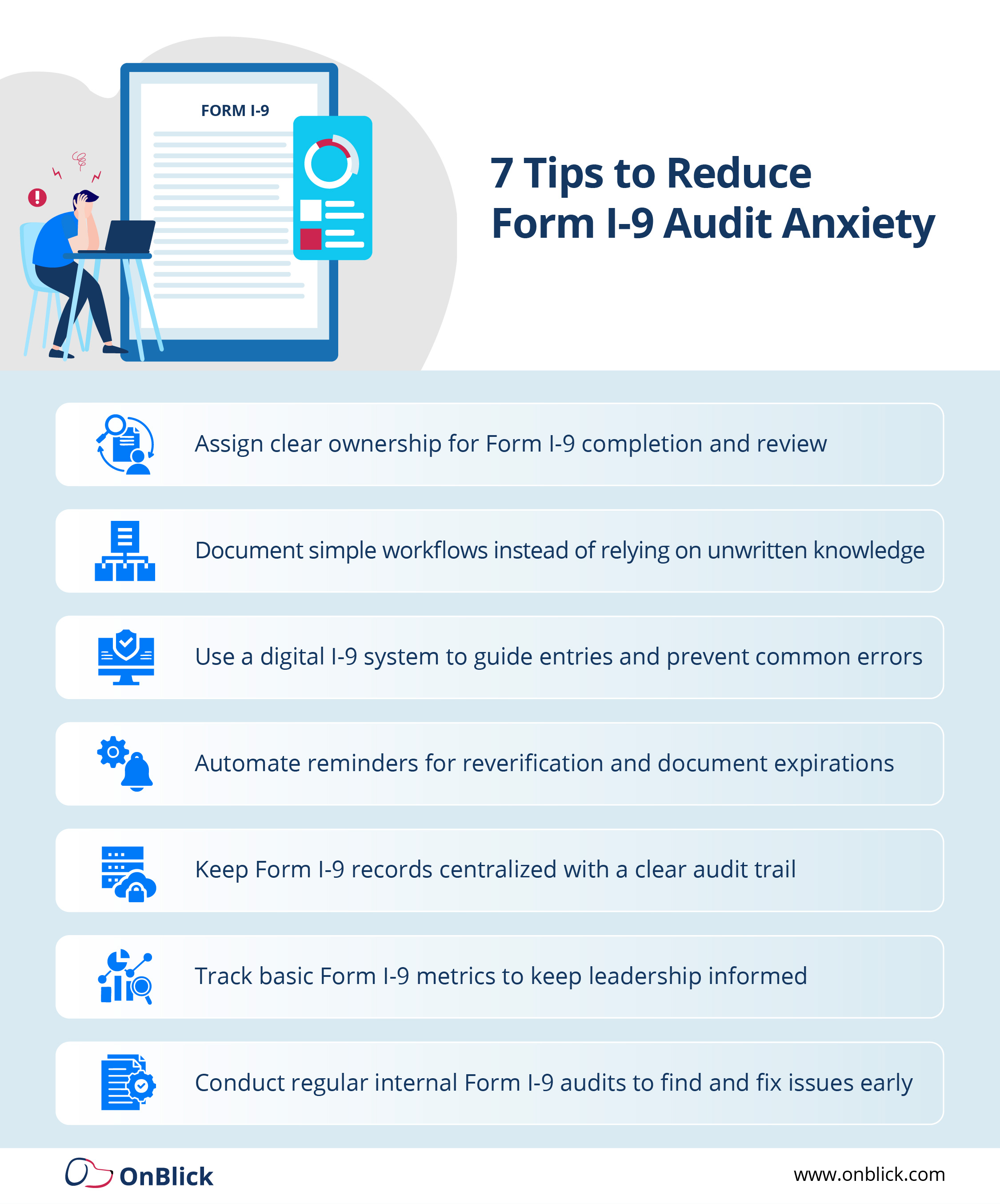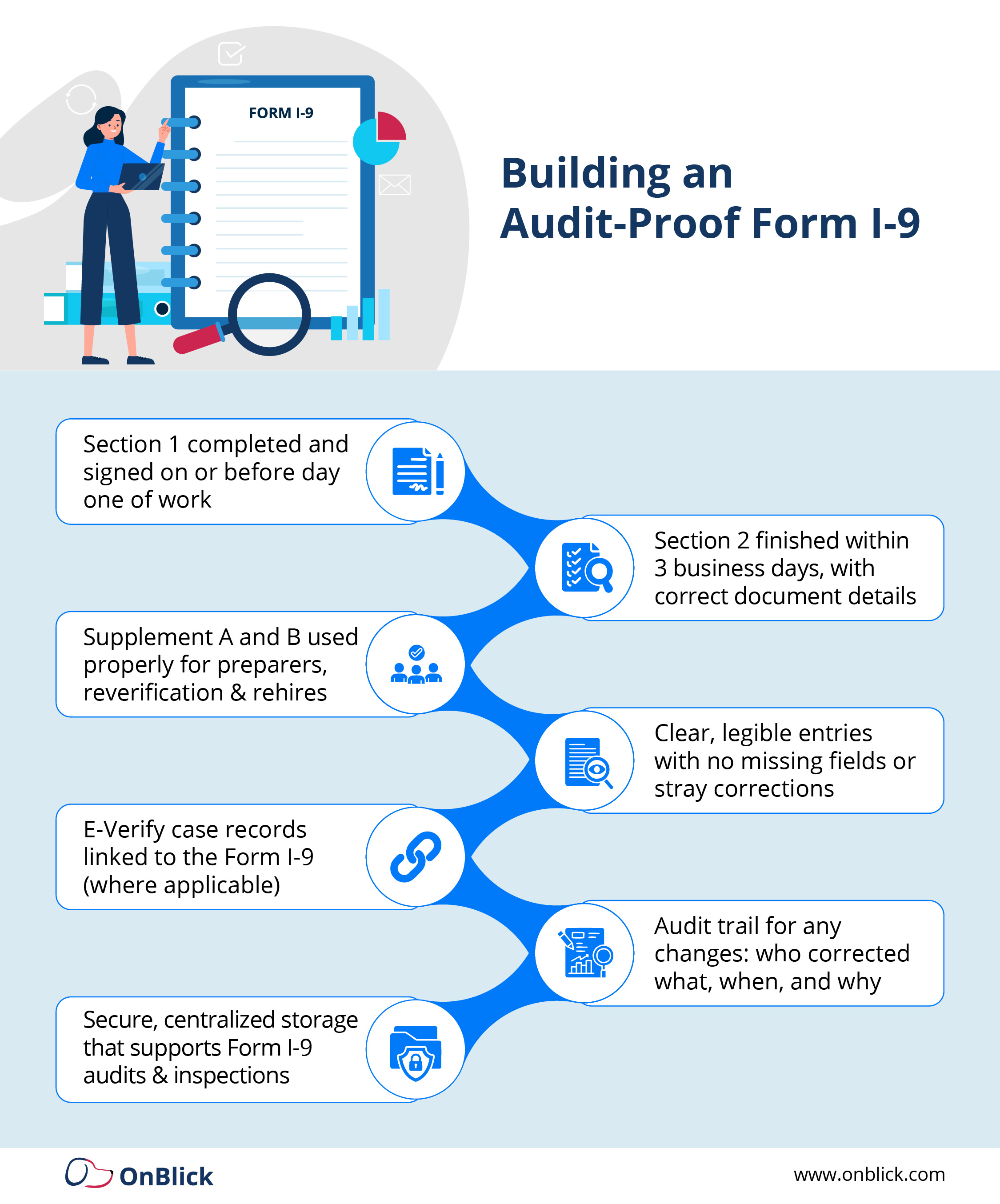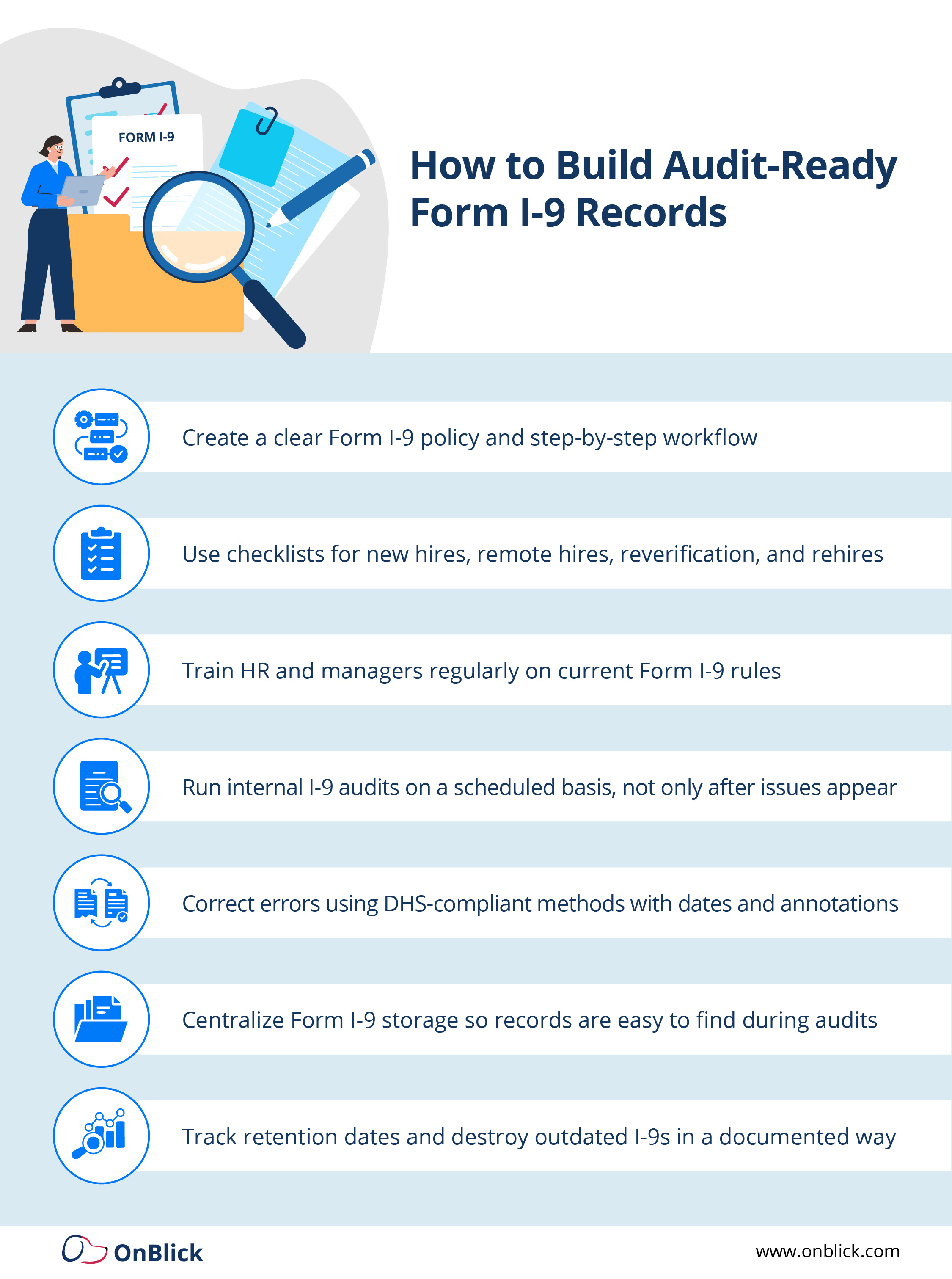 - Run internal I-9 audits regularly and correct issues in a documented way