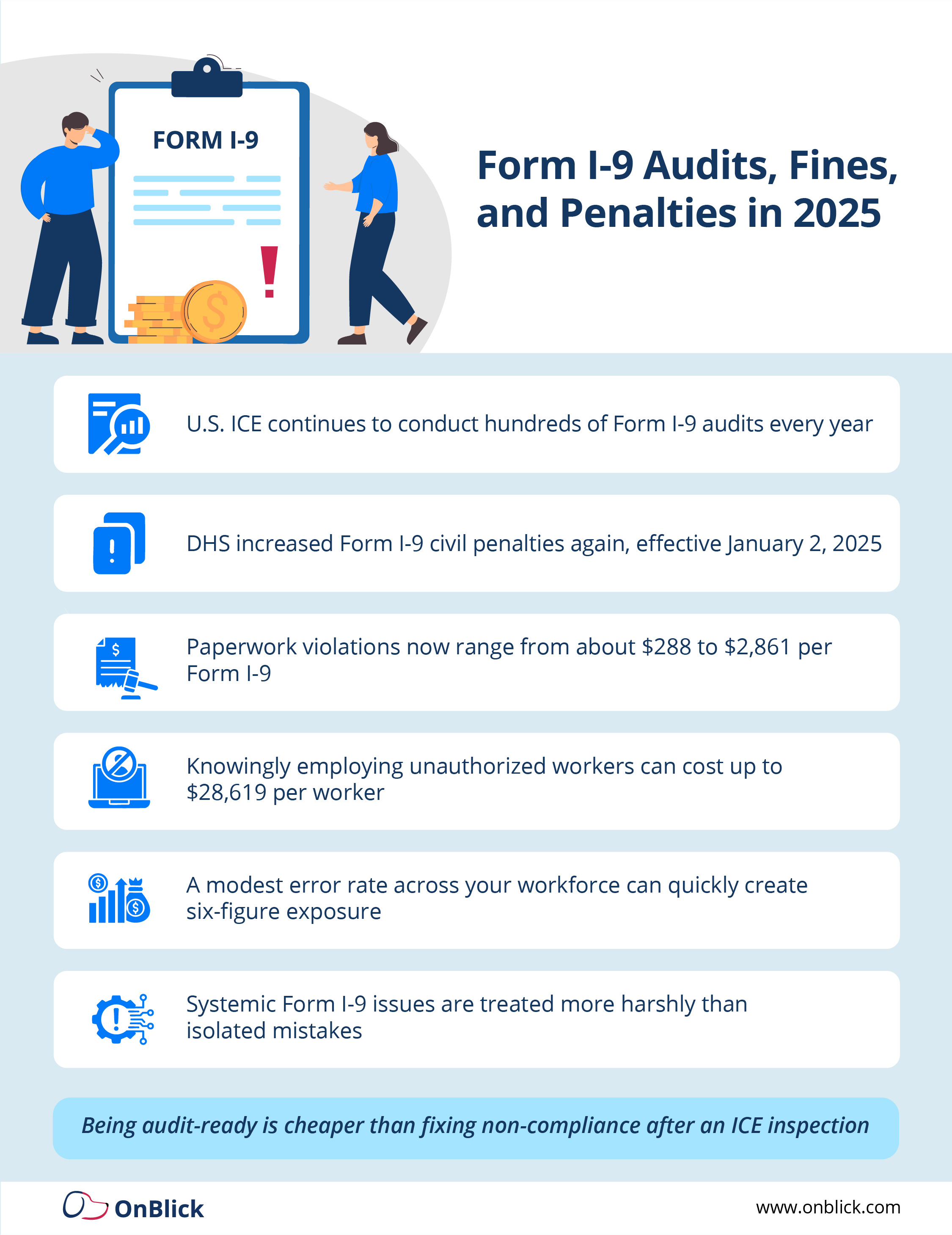 For HR and compliance leaders, this means I-9 audit readiness is not just about avoiding “small” technical fines. It is about reducing the risk of major financial penalties, enforcement actions, and reputational damage that come with being flagged as a non-compliant employer.