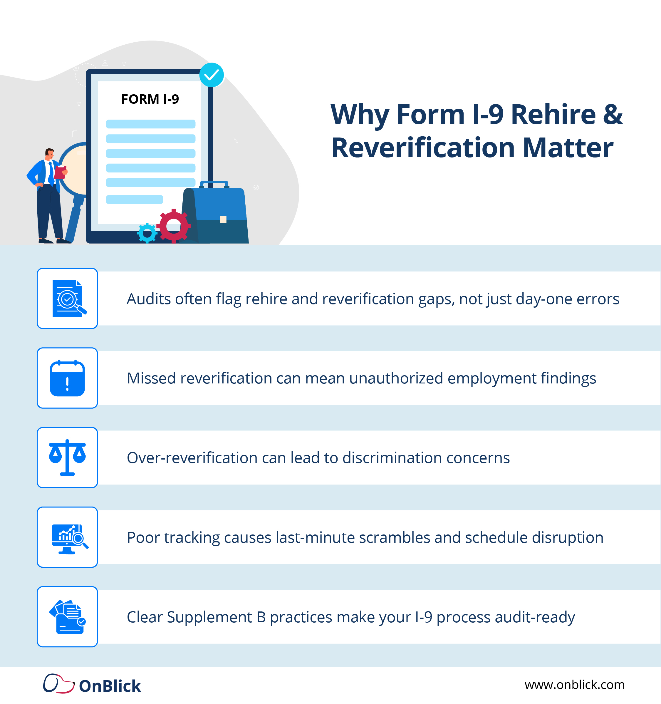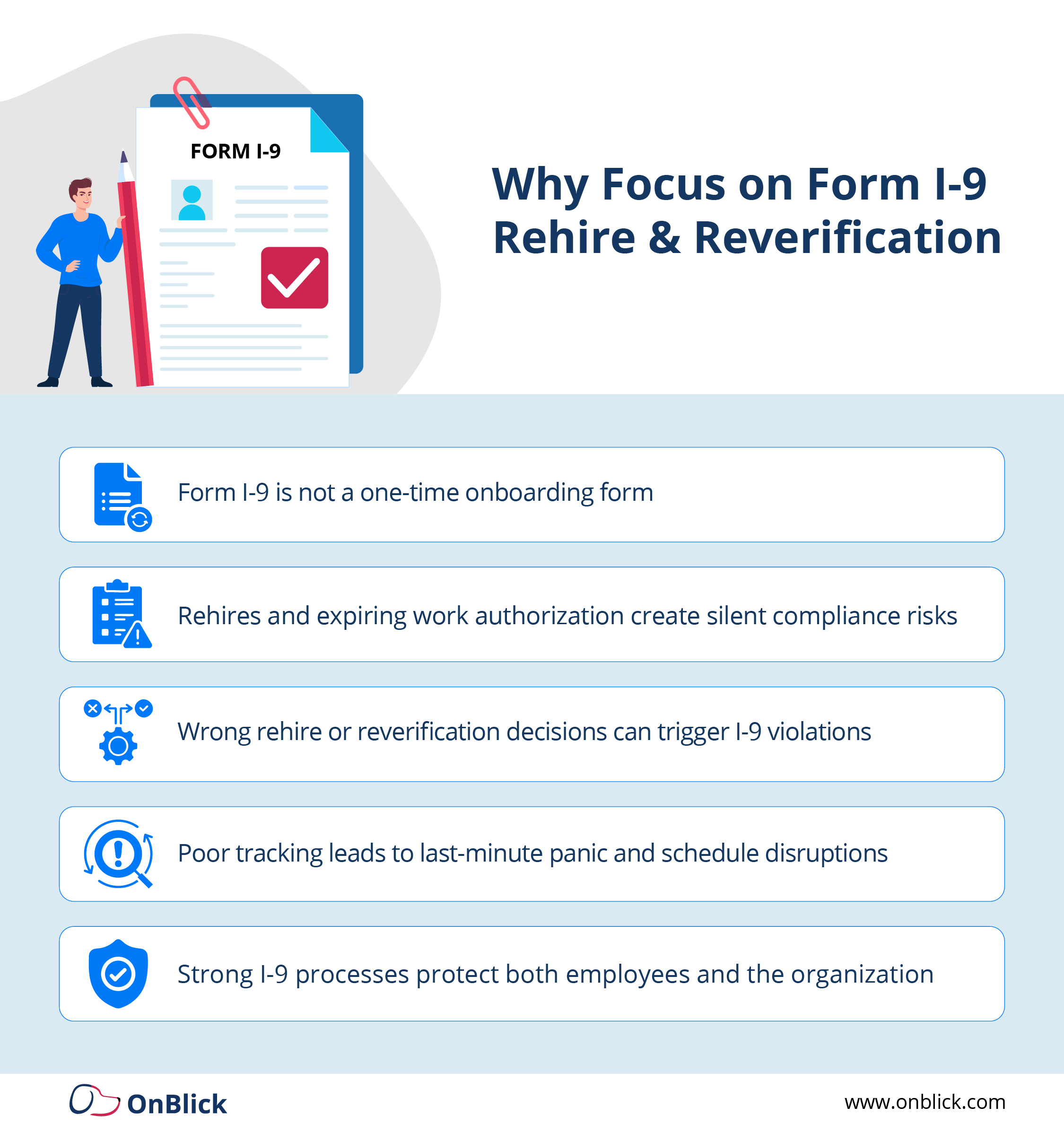 From a strategic standpoint, leadership should be able to see simple metrics: how many employees have upcoming reverification dates, how many i 9 rehire events are being recorded each quarter, how many I-9 errors are found in internal audits, and how much time HR saves by using digital workflows instead of paper files. This is where a platform like OnBlick adds value, by centralizing I-9s, tracking rehire and reverification events, generating alerts for expiring authorization, and creating audit-ready reports that tie HR actions back to clear data.