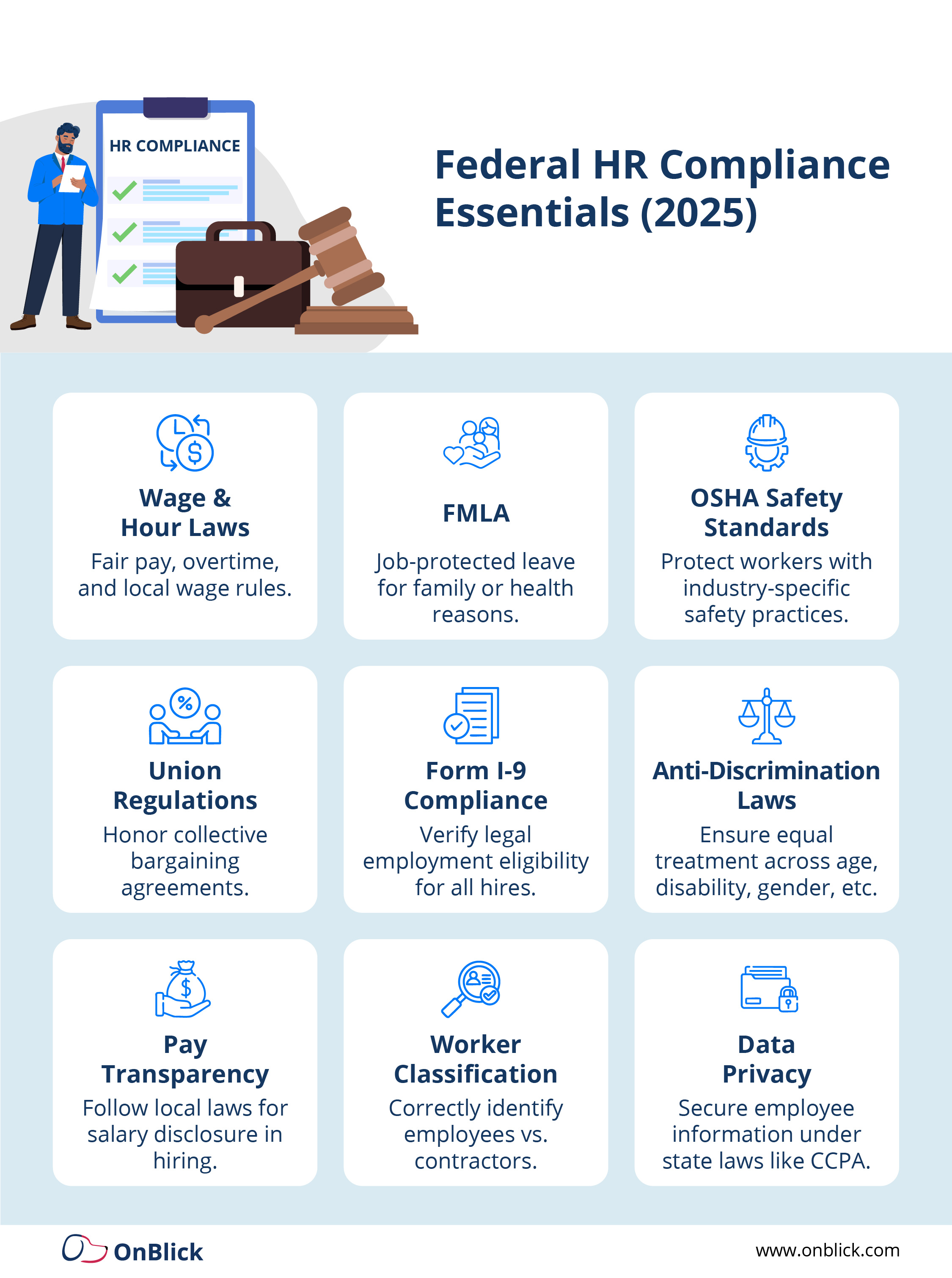 HR compliance in the U.S. is governed by a complex web of federal, state, and local regulations. While the situation continues to evolve, several foundational federal laws remain central to compliance in 2025. Understanding these laws and how they interact with regional requirements is essential for every HR professional.