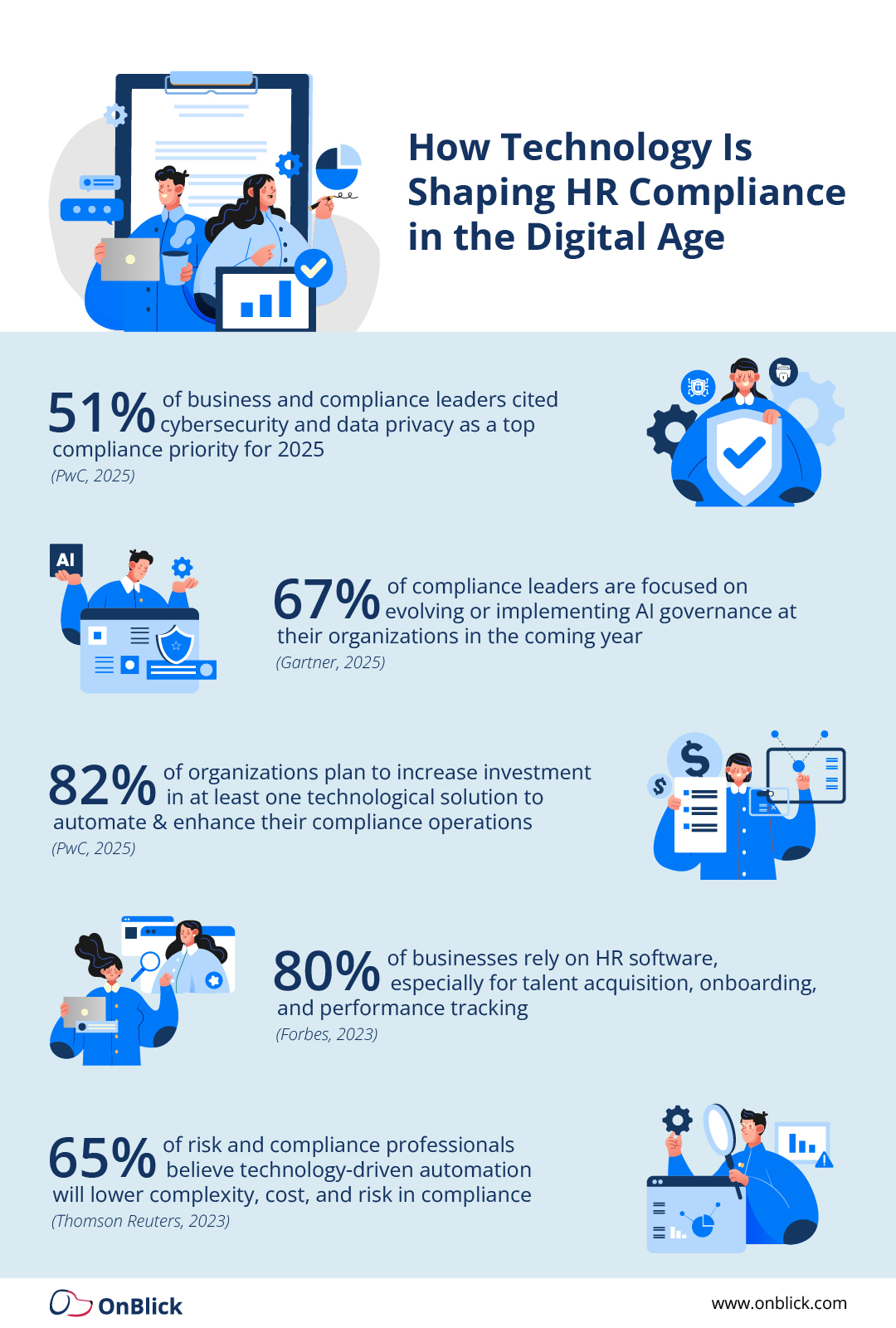 For example, 82% of organizations plan to increase investment in at least one technological solution to automate and enhance their compliance operations, reflecting a clear industry trend toward digital transformation (PwC, 2025). AI and machine learning are also being leveraged to monitor regulatory changes, flag potential risks, and support predictive analytics for workforce compliance issues. Also, HR software is now widely used for critical functions like talent acquisition, onboarding, and performance tracking, helping organizations maintain consistent and compliant processes throughout the employee lifecycle (Forbes , 2023)