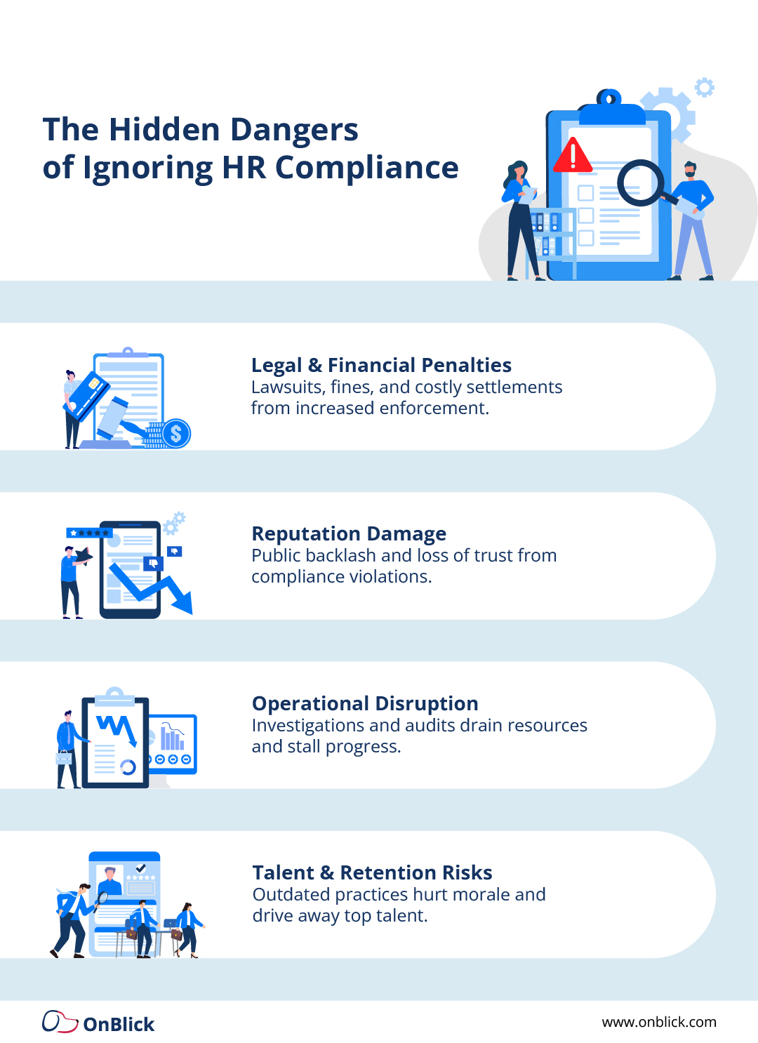 HR compliance isn’t just a legal formality; it’s a critical safeguard for your organization’s reputation, workforce, and bottom line. Failing to keep up with evolving regulations can expose your company to a range of serious consequences.