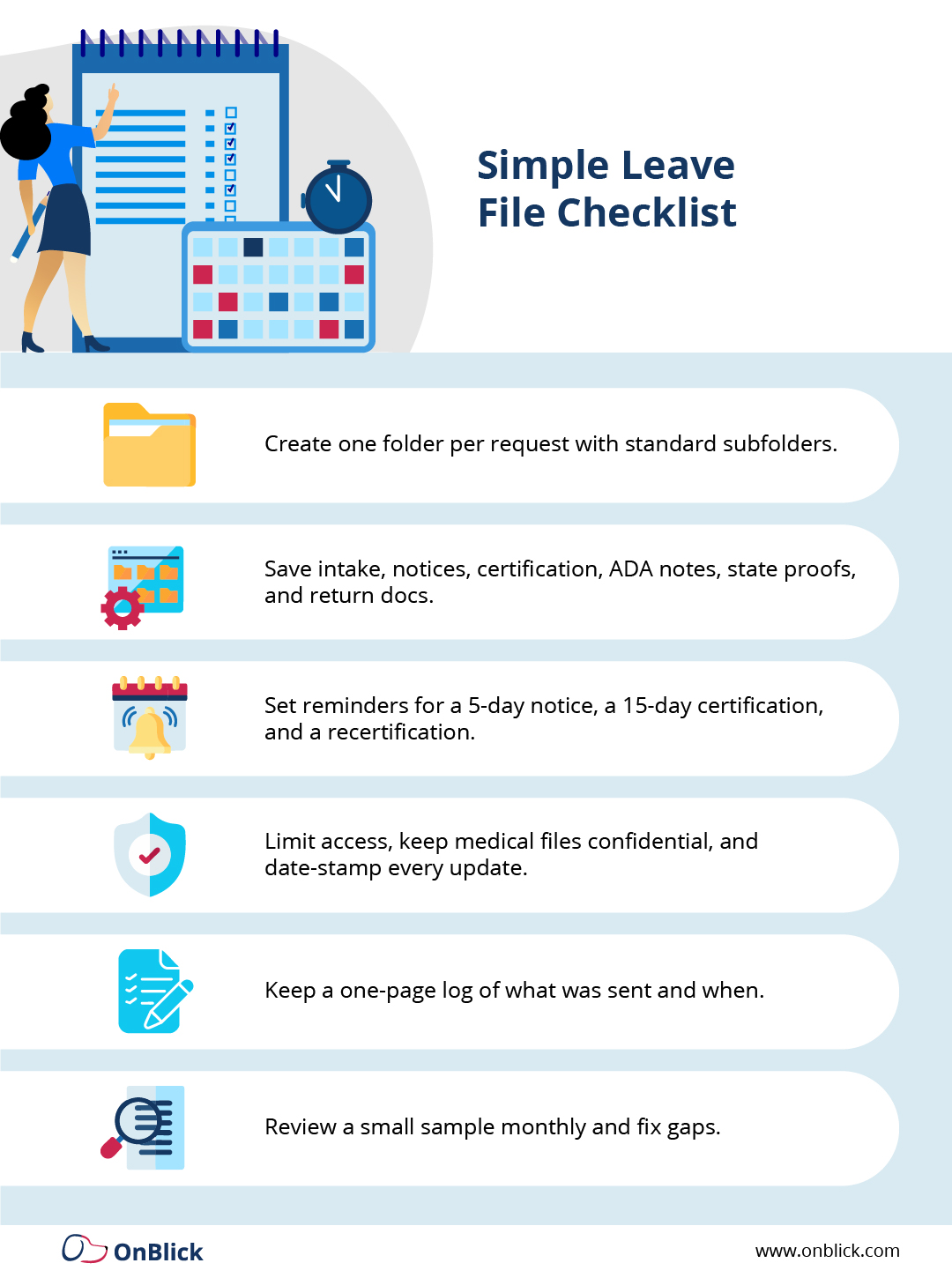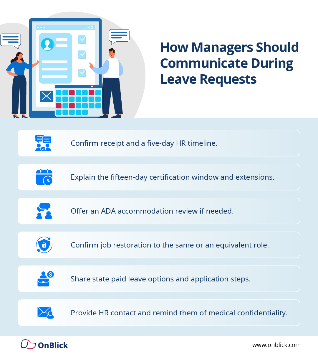 For organizations seeking to make leave management a seamless experience, OnBlick provides automation and compliance-ready workflows for requests, notices, tracking, audits, and time capture.