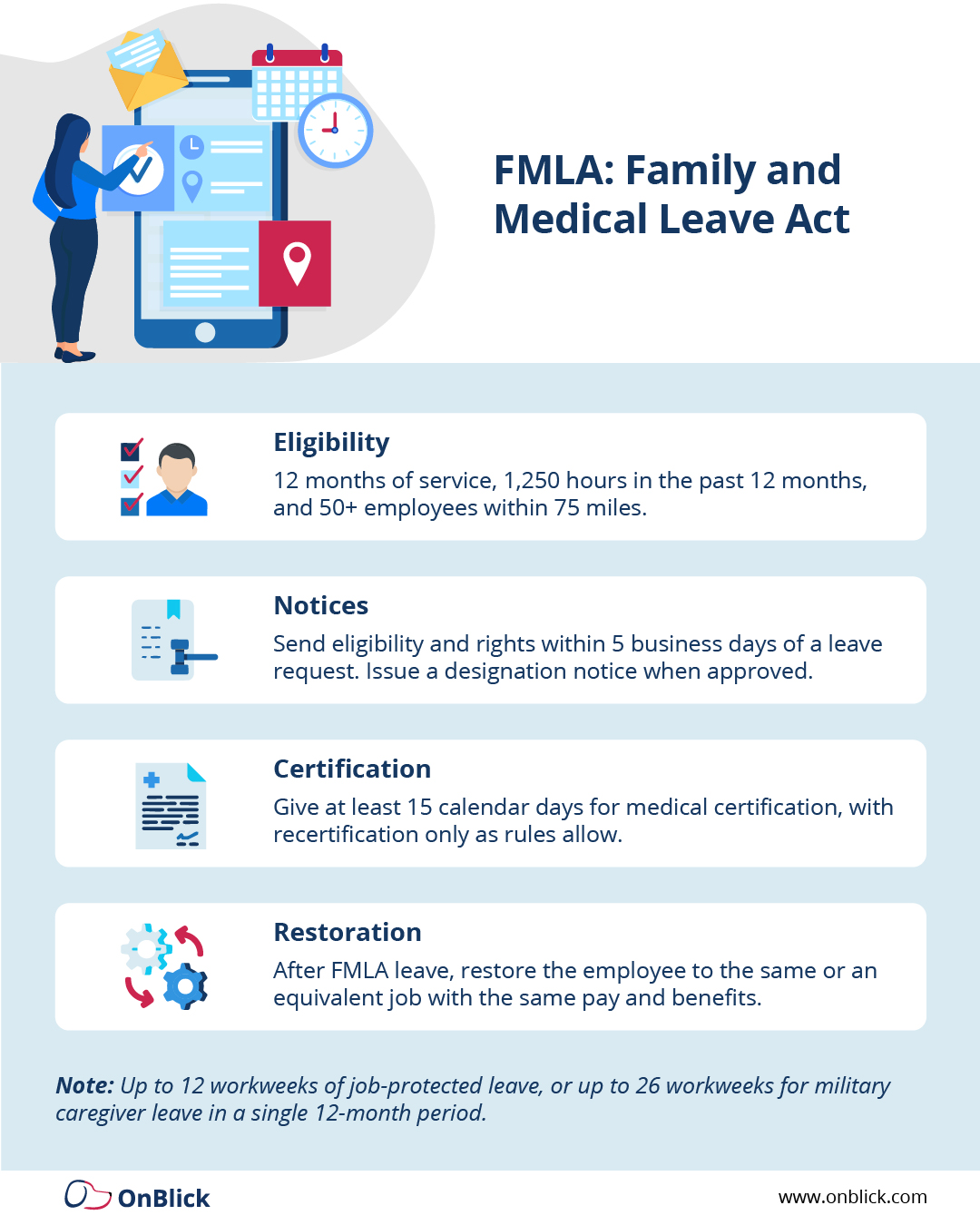 - Clarify job restoration: Confirm restoration to the same or an equivalent position with the same pay and benefits at the end of qualifying FMLA leave.