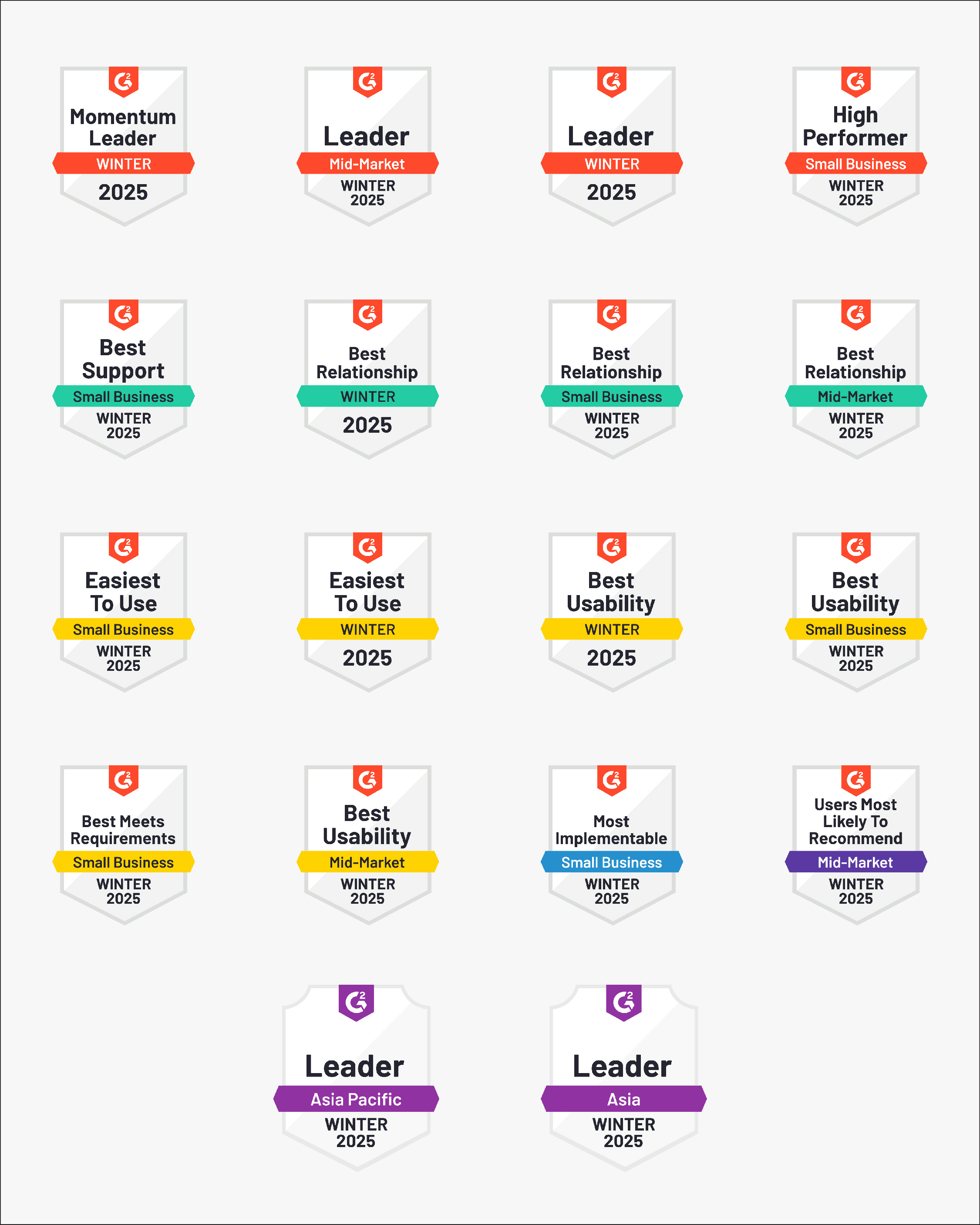 - High Performer: High Performer (overall), High Performer (Small-Business), High Performer (Mid-Market), High Performer (Asia / Asia Pacific)