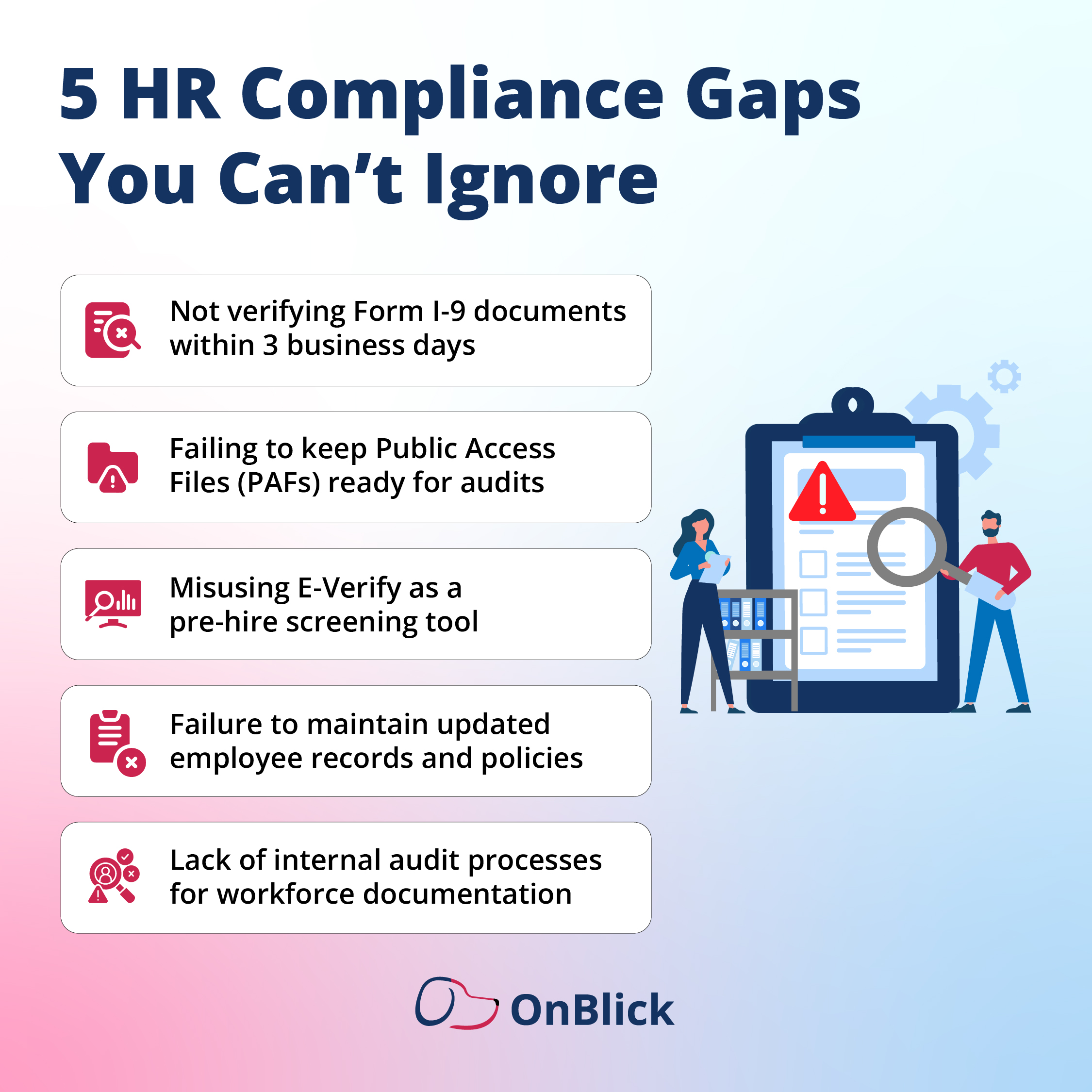 OnBlick brings Form I-9 and E-Verify workflows, PAF management, and policy tracking into one place with timers, alerts, and audit-ready logs. Dashboards surface expiring documents, open tasks, and exception trends, while integrations reduce duplicate entry. Our team also supports internal I-9 audits, E-Verify desk review preparation, and retention guidance.