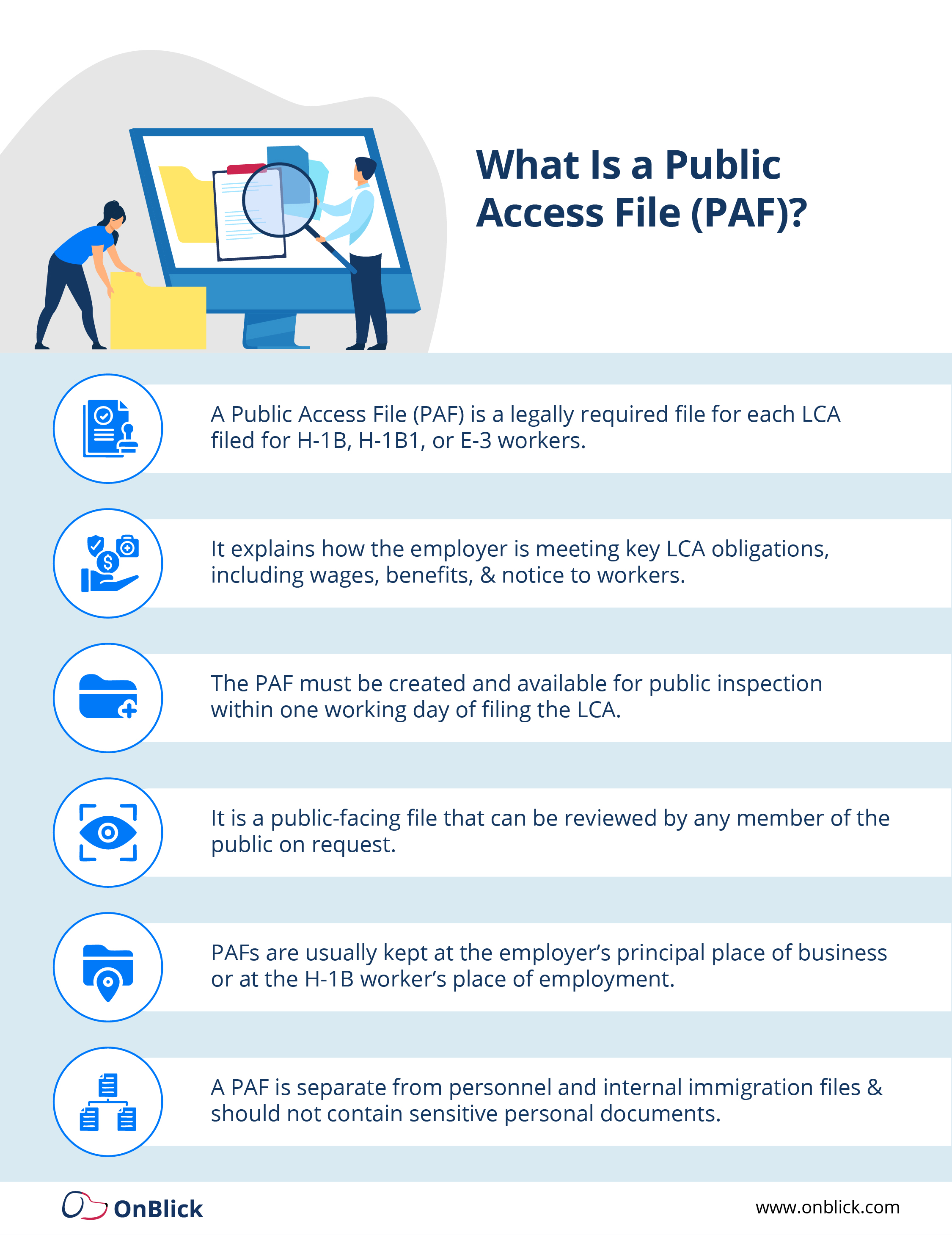 A Public Access File (PAF) is a file that H-1B, H-1B1, and E-3 employers are legally required to create and maintain for each Labor Condition Application (LCA) they file. It is tied to a specific LCA file, and it is meant to give the public insight into how the employer is meeting key LCA obligations, including wages and notice to workers.
