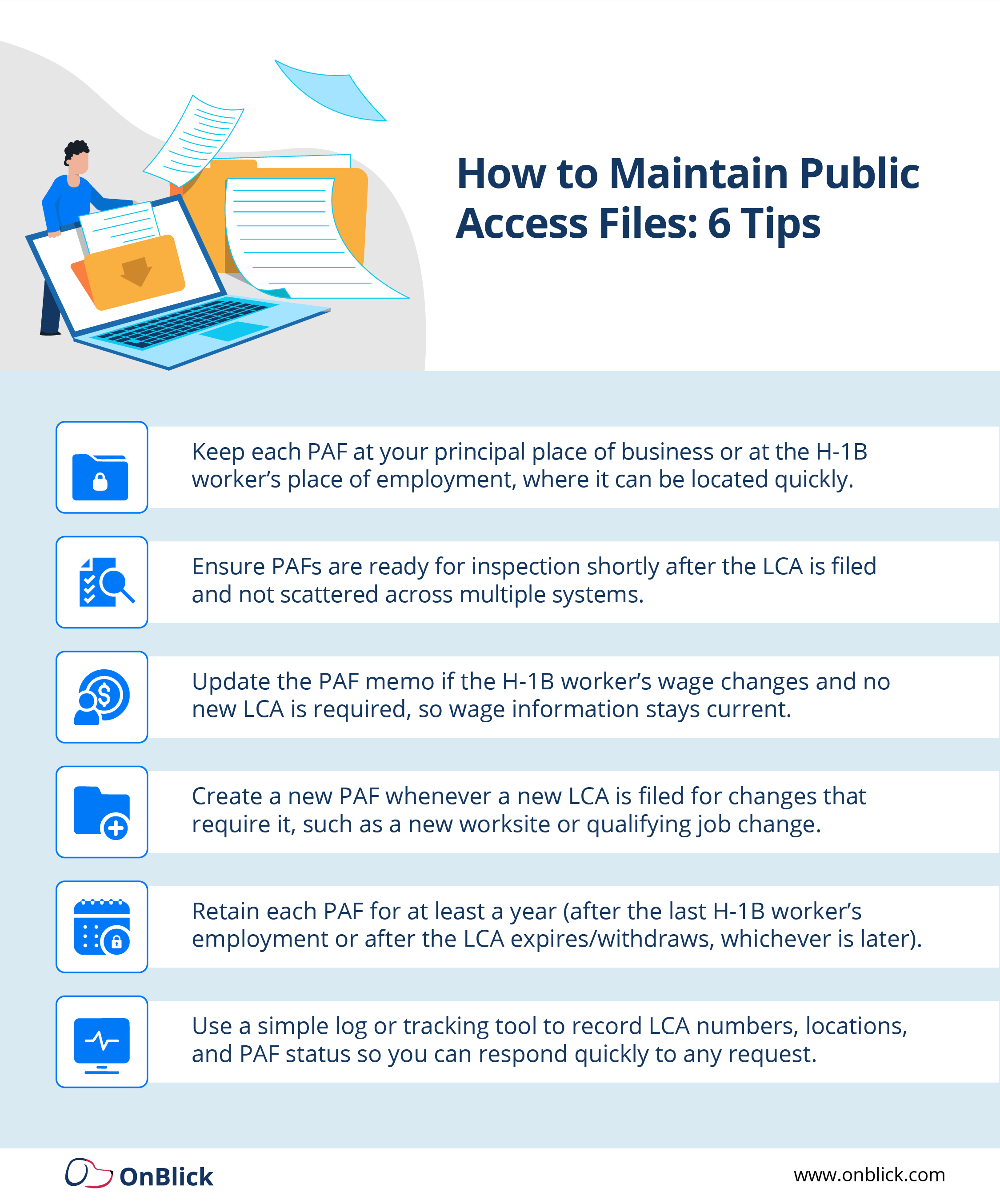 Having a complete public access file is only the first step. H-1B employers also need to keep PAFs in the right place, make them available when requested, and know how long to retain them.