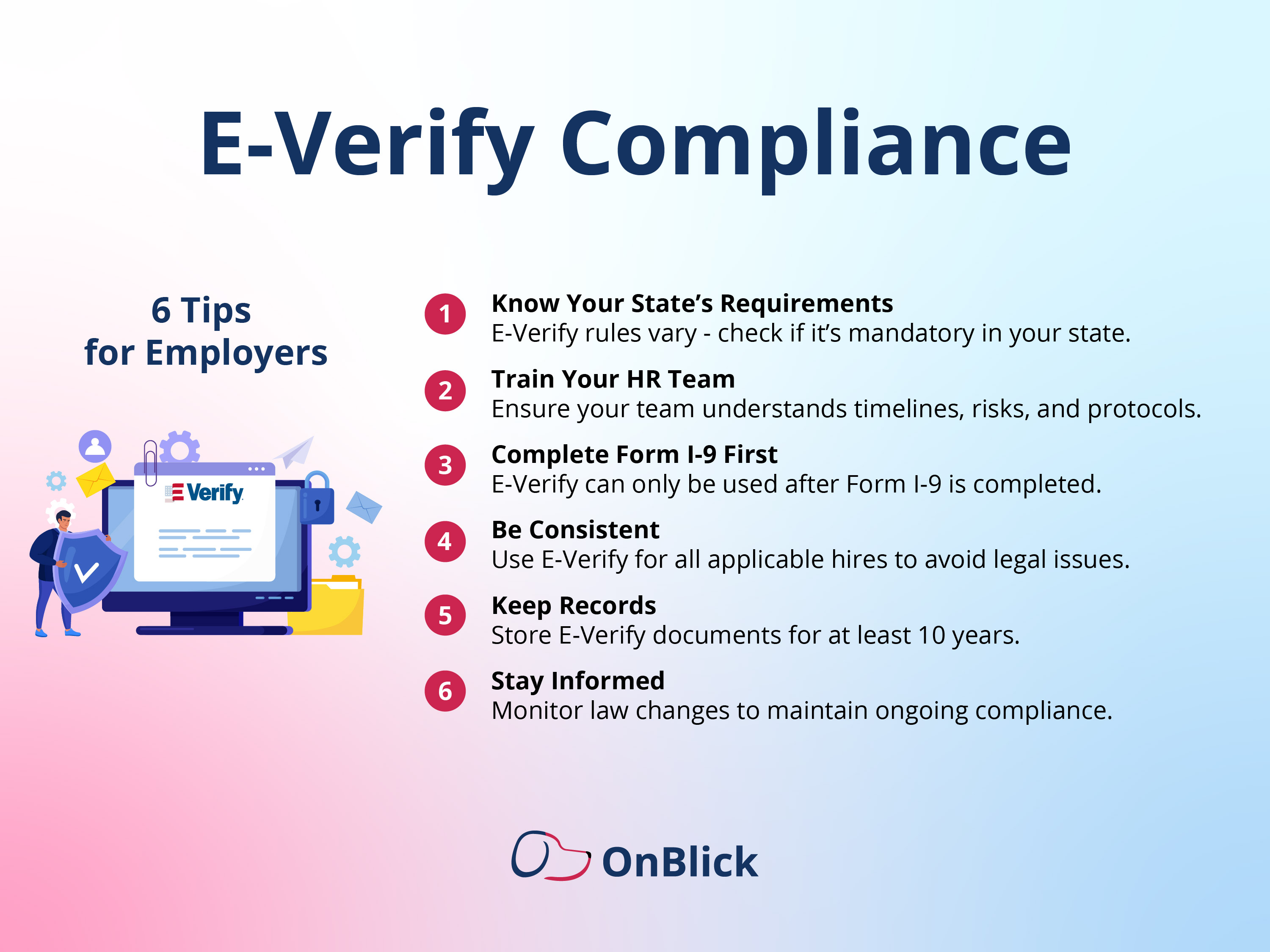 - Compliance with Federal and State Laws: E-Verify helps employers comply with immigration and employment laws. It can also protect businesses from penalties associated with hiring unauthorized workers.