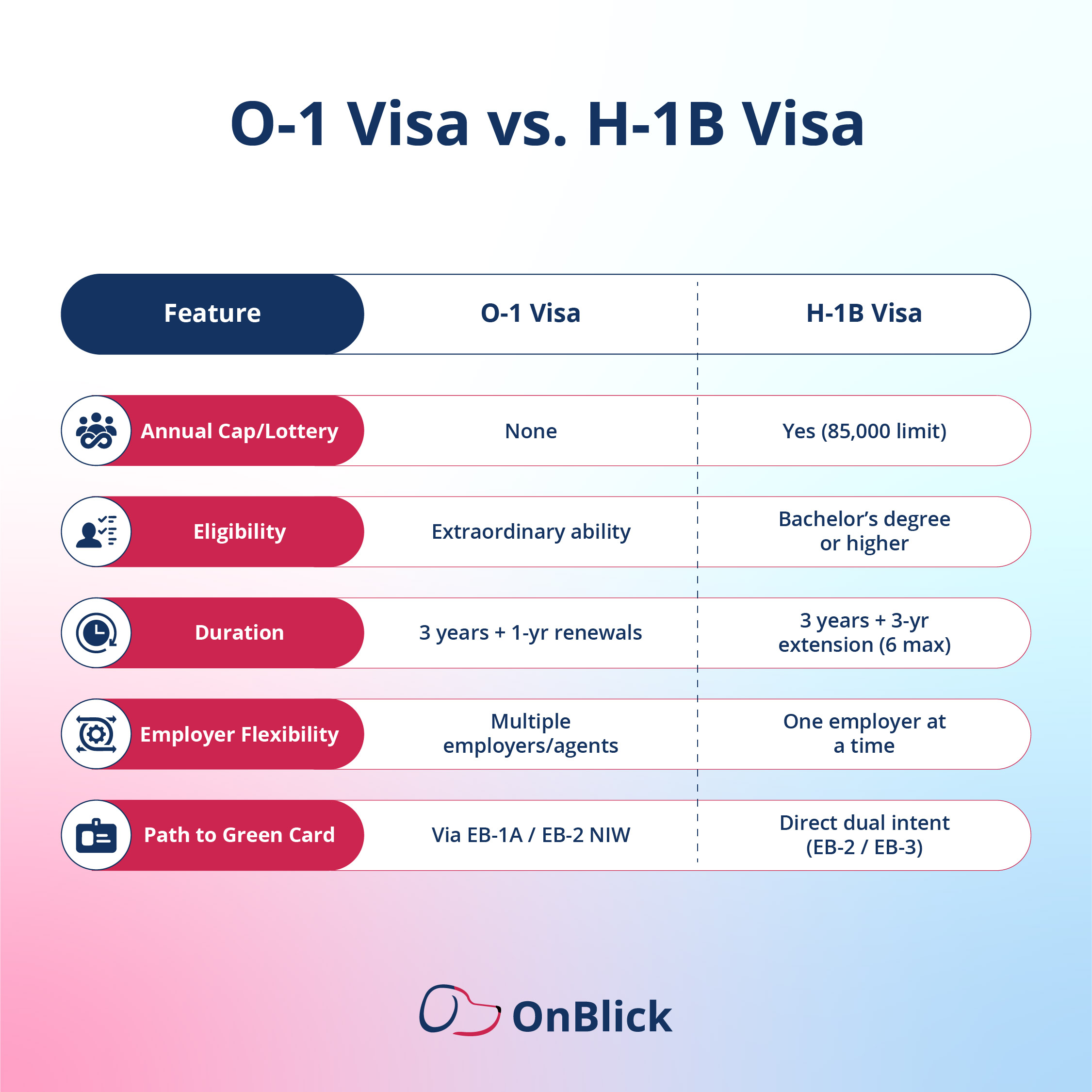 O-1 holders often aim for EB-1A (Extraordinary Ability) or EB-2 NIW later; O-1 isn’t a “dual-intent” category by statute, but many O-1s successfully pursue immigrant petitions when well-documented.