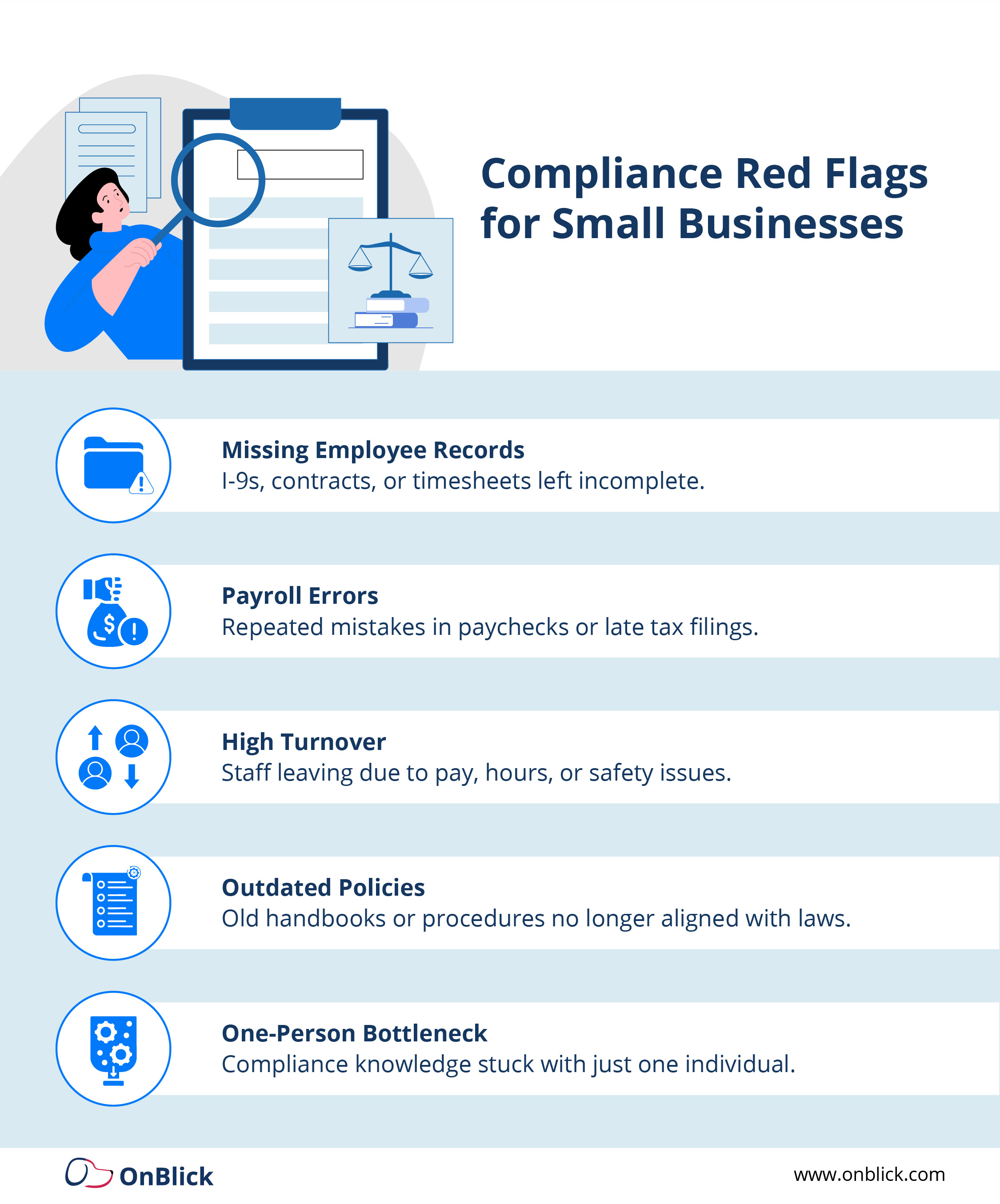 5. One-Person Bottleneck: When only the owner or a single manager knows how compliance is handled, the risk of errors increases, and continuity suffers if that person is unavailable.