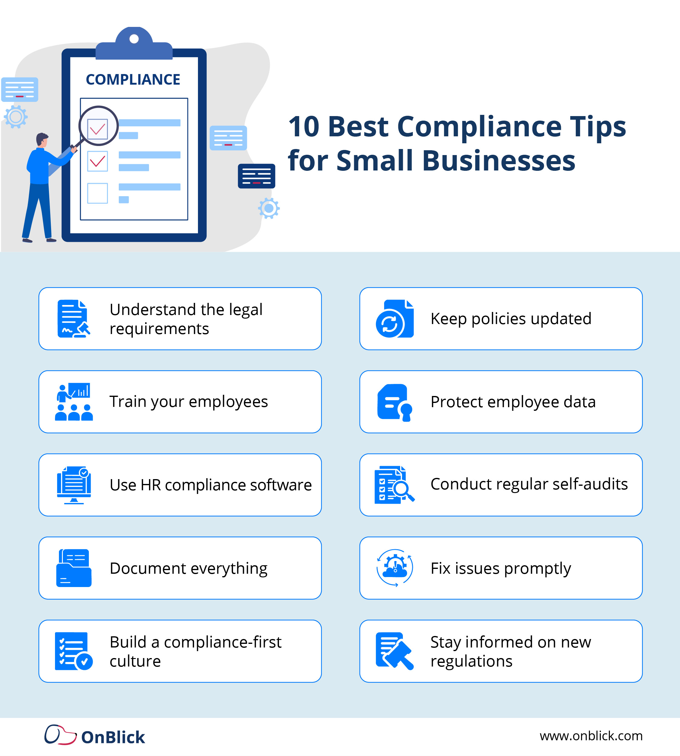 For example, platforms like OnBlick offer comprehensive yet user-friendly solutions tailored to small business compliance needs, helping manage employee documentation, onboarding, and immigration requirements seamlessly and then generating audit-ready reports with minimal effort. Leveraging such tools enables small businesses to maintain compliance efficiently, reduce risks, and focus more on growing their core business.