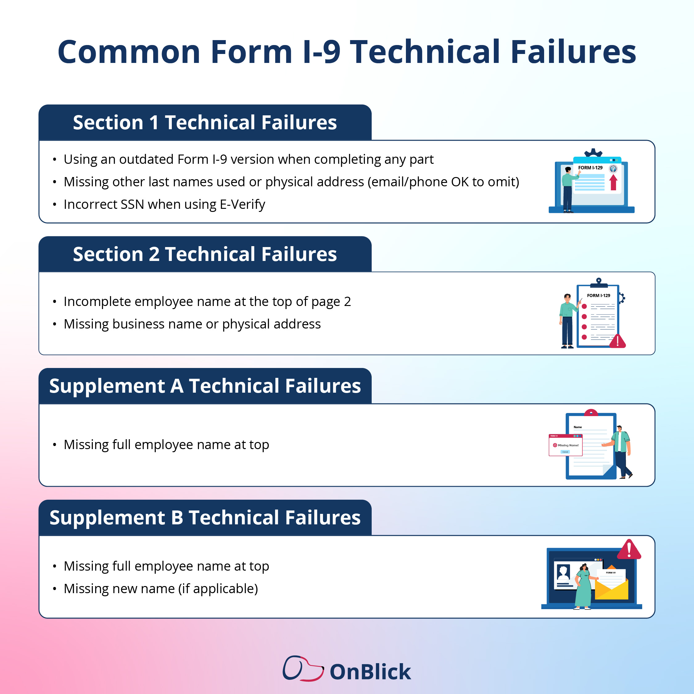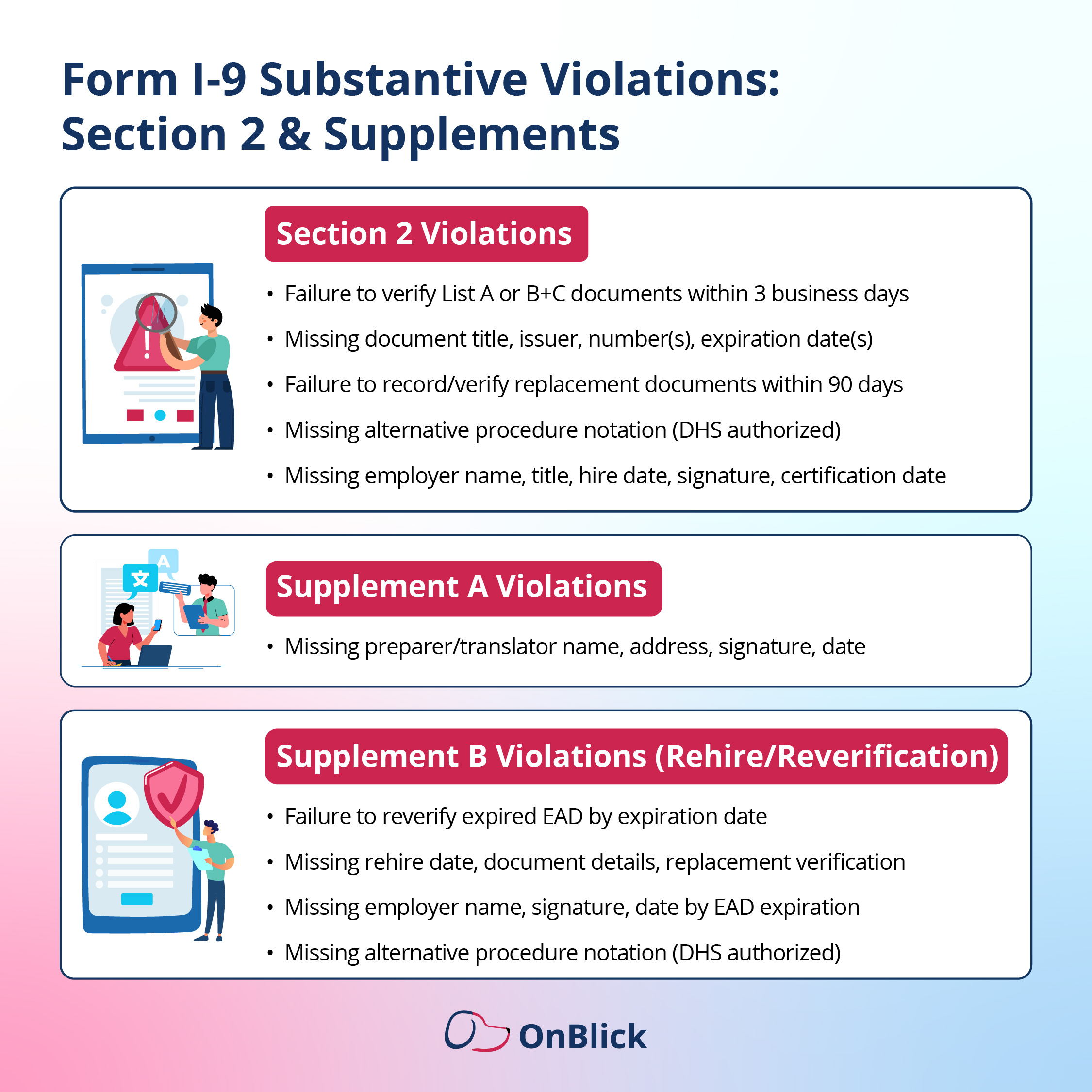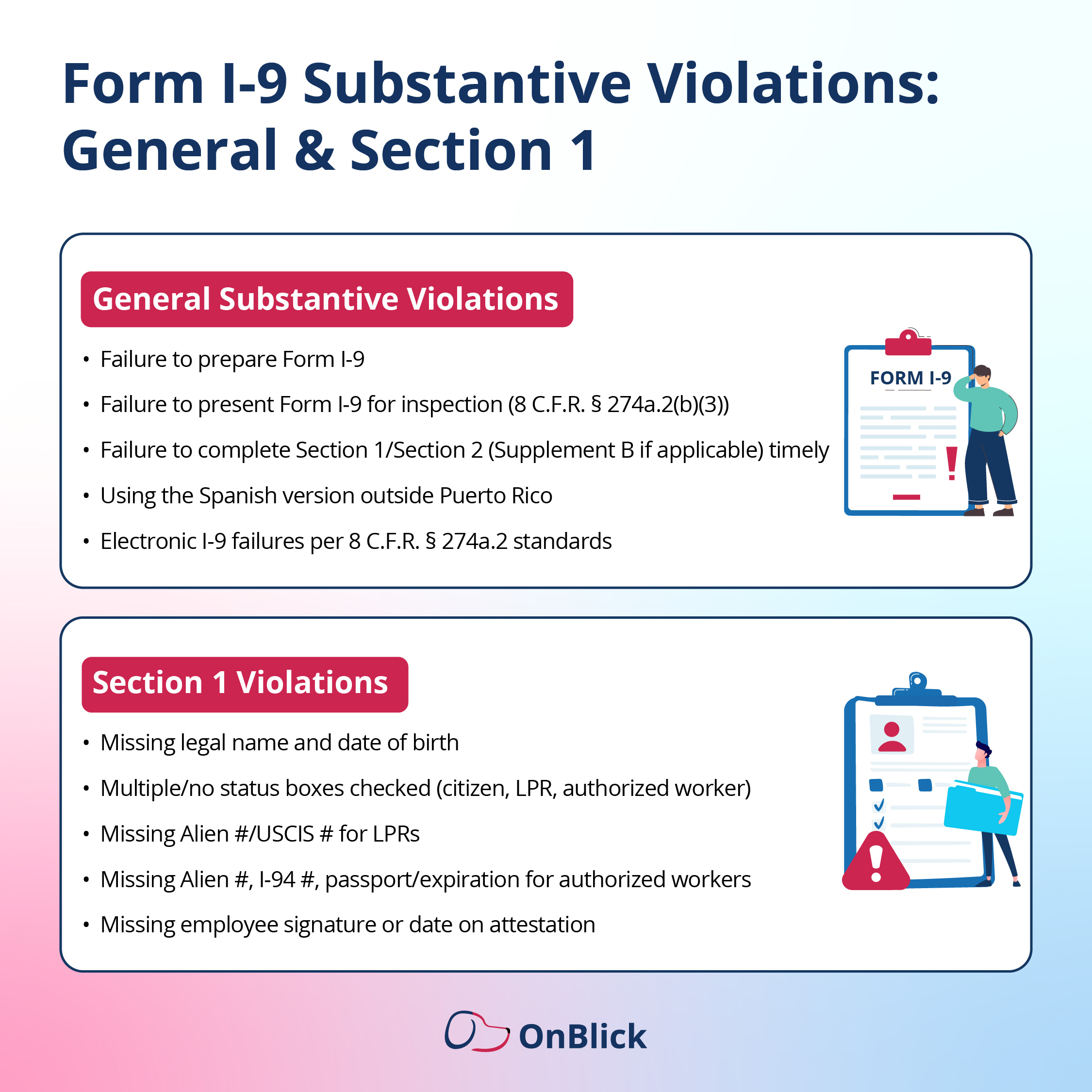 Technical issues may involve correctable errors in the form, while substantive violations are more serious as they affect whether the form was properly completed or whether the employer met the legal verification requirement.