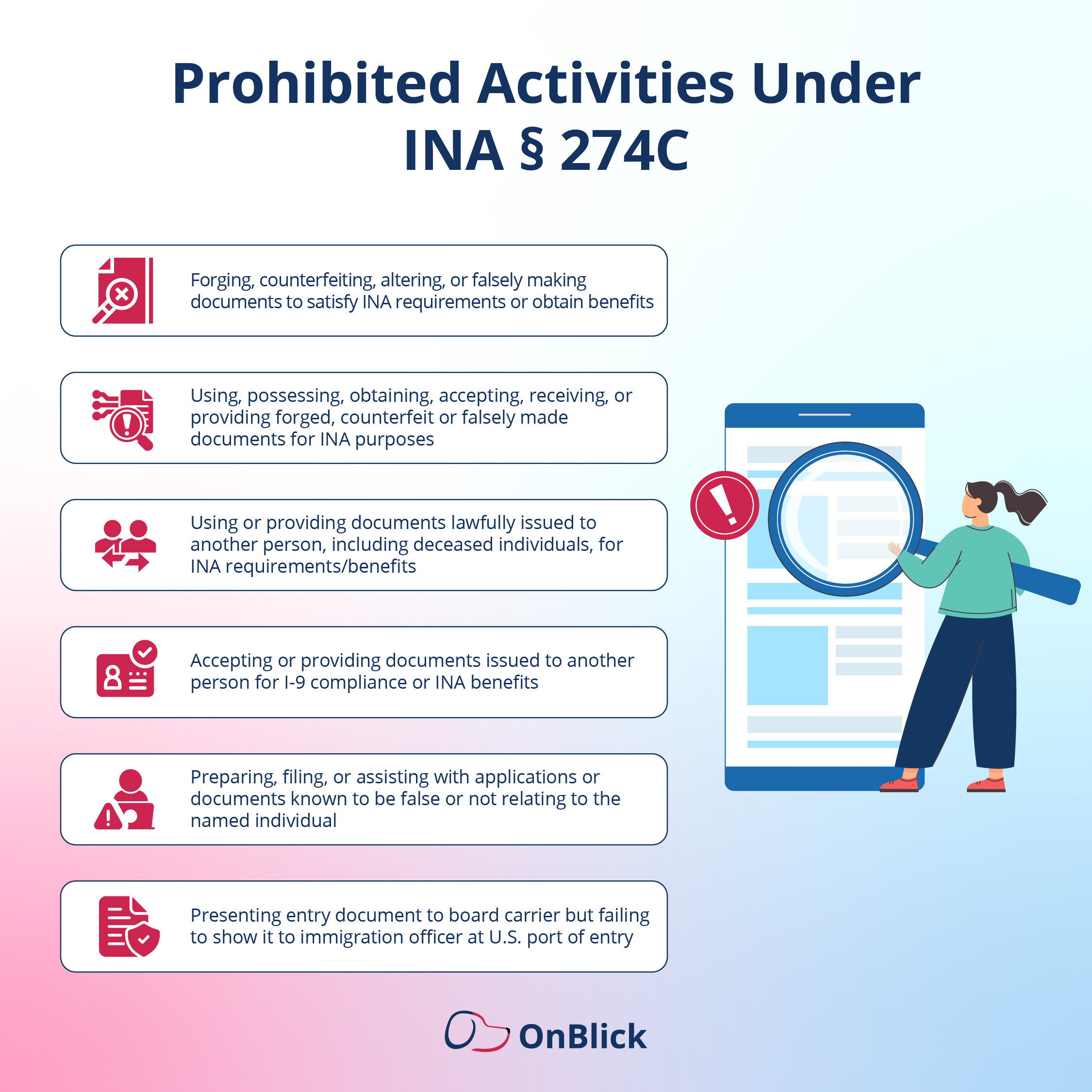 INA § 274C prohibits a range of acts involving fraudulent or improper documents. These include forging, altering, counterfeiting, or falsely making documents for immigration or employment-related purposes, as well as using or providing documents that do not lawfully relate to the person presenting them.