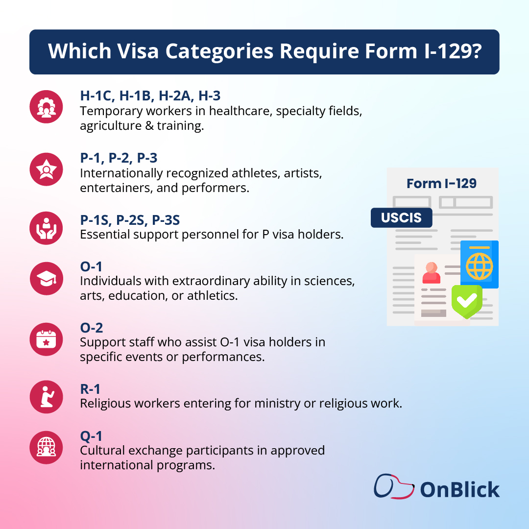 Form I-129 is the primary petition used by U.S. employers to sponsor foreign nationals for temporary work visas. It covers several nonimmigrant classifications, including: