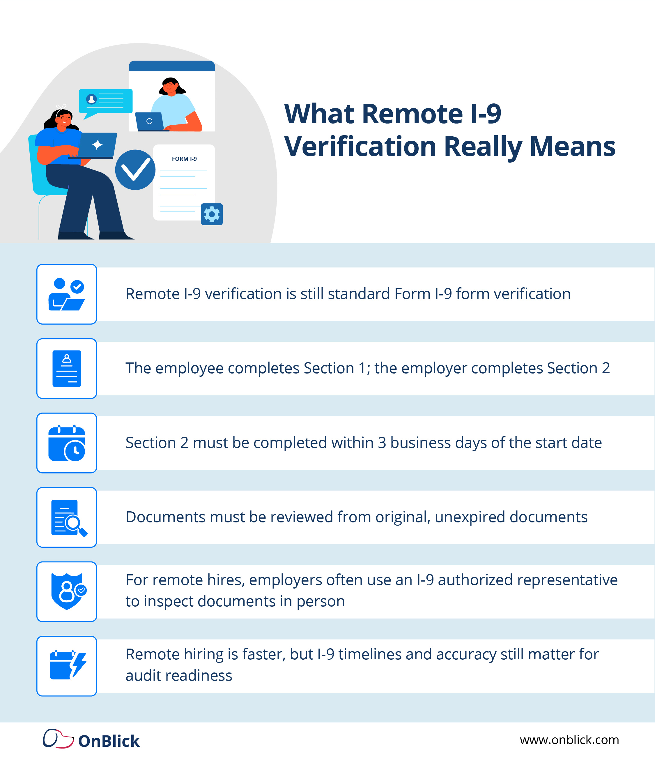 - Remote hiring doesn’t change your Form I-9 obligations; it just changes how you coordinate document inspection.