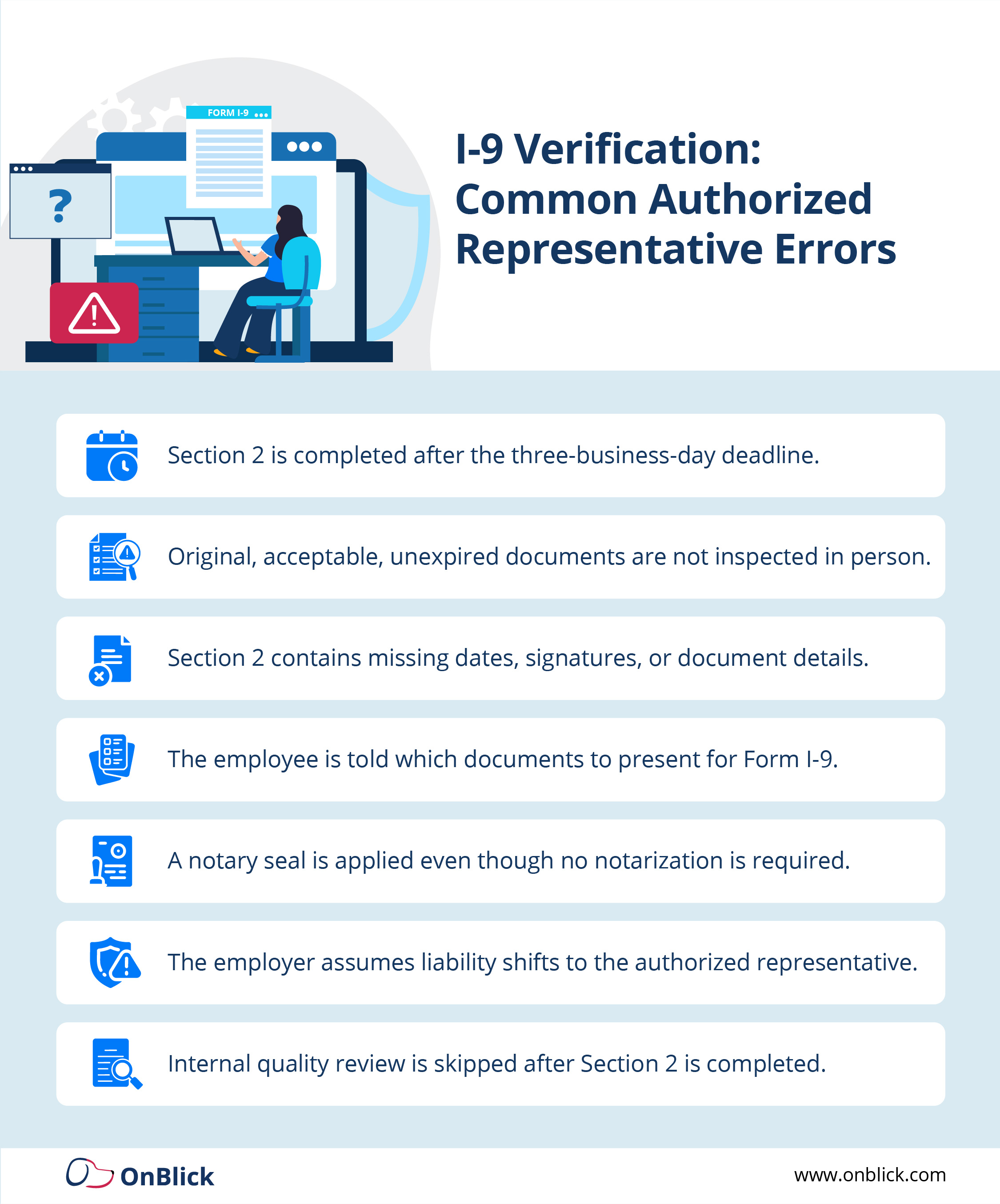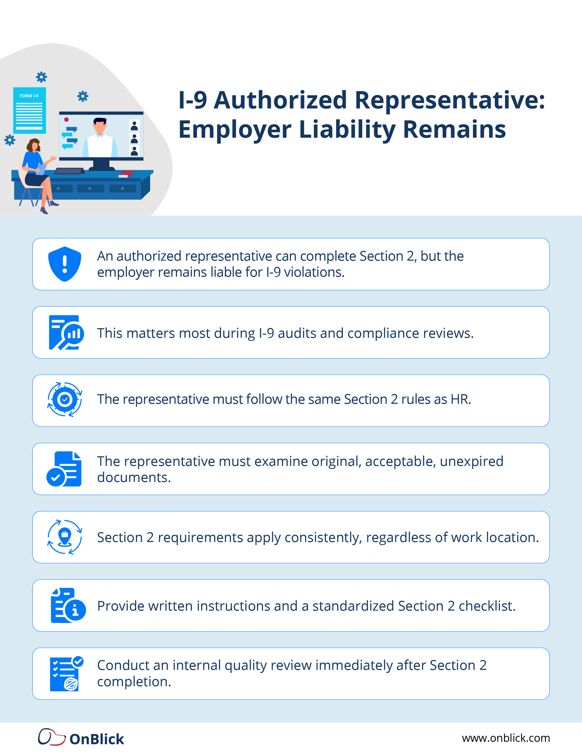- Employers remain liable for any errors made by an authorized representative i-9, so training and clear instructions are essential.