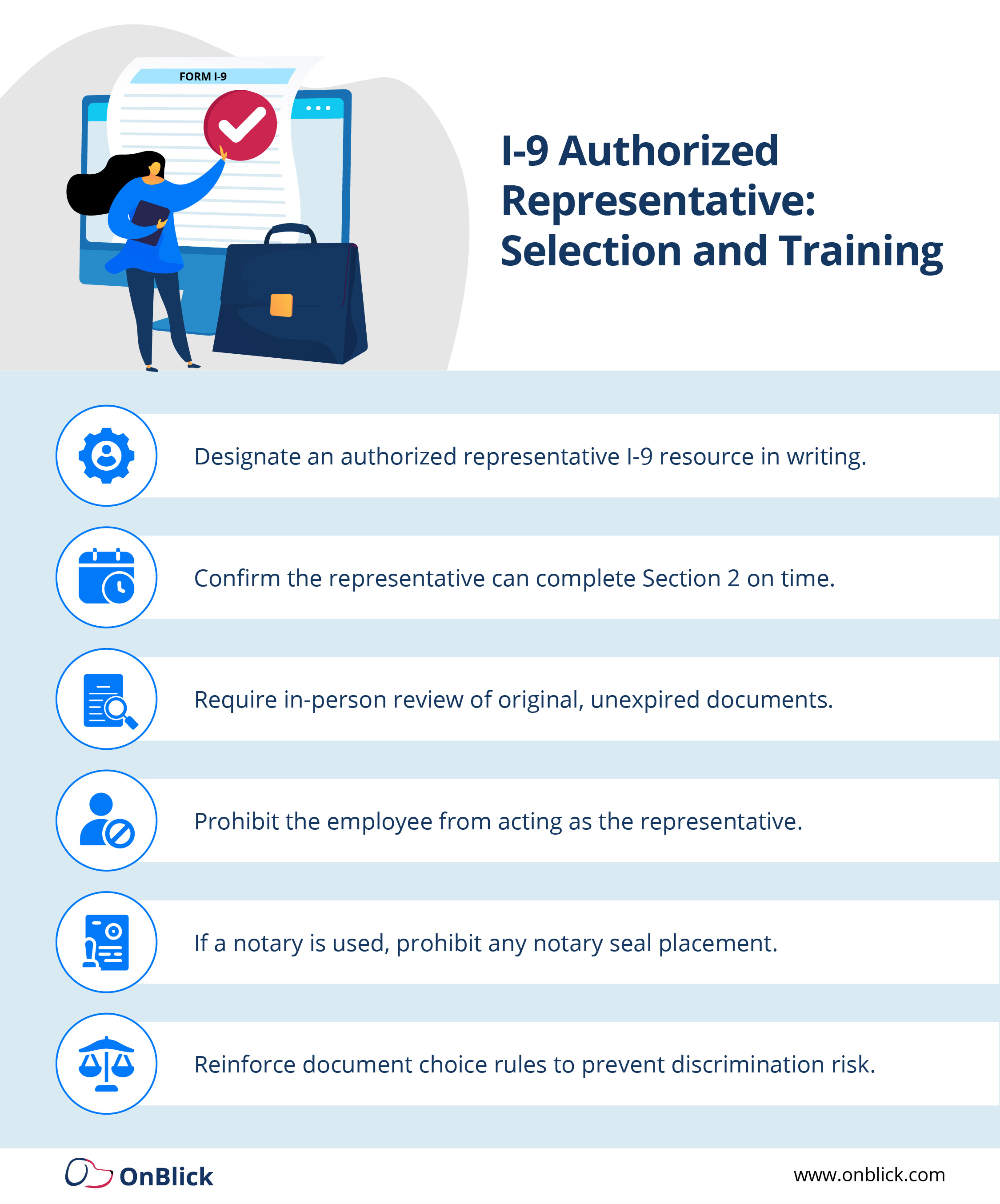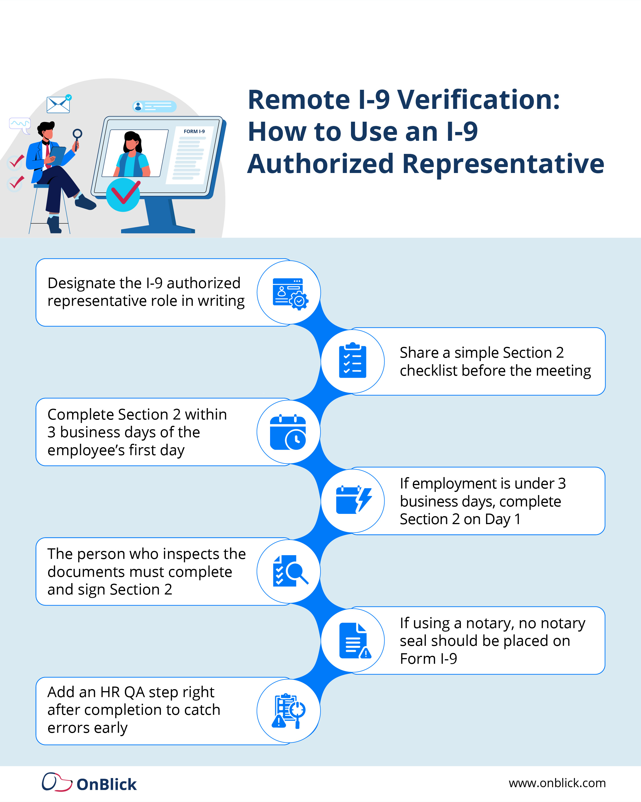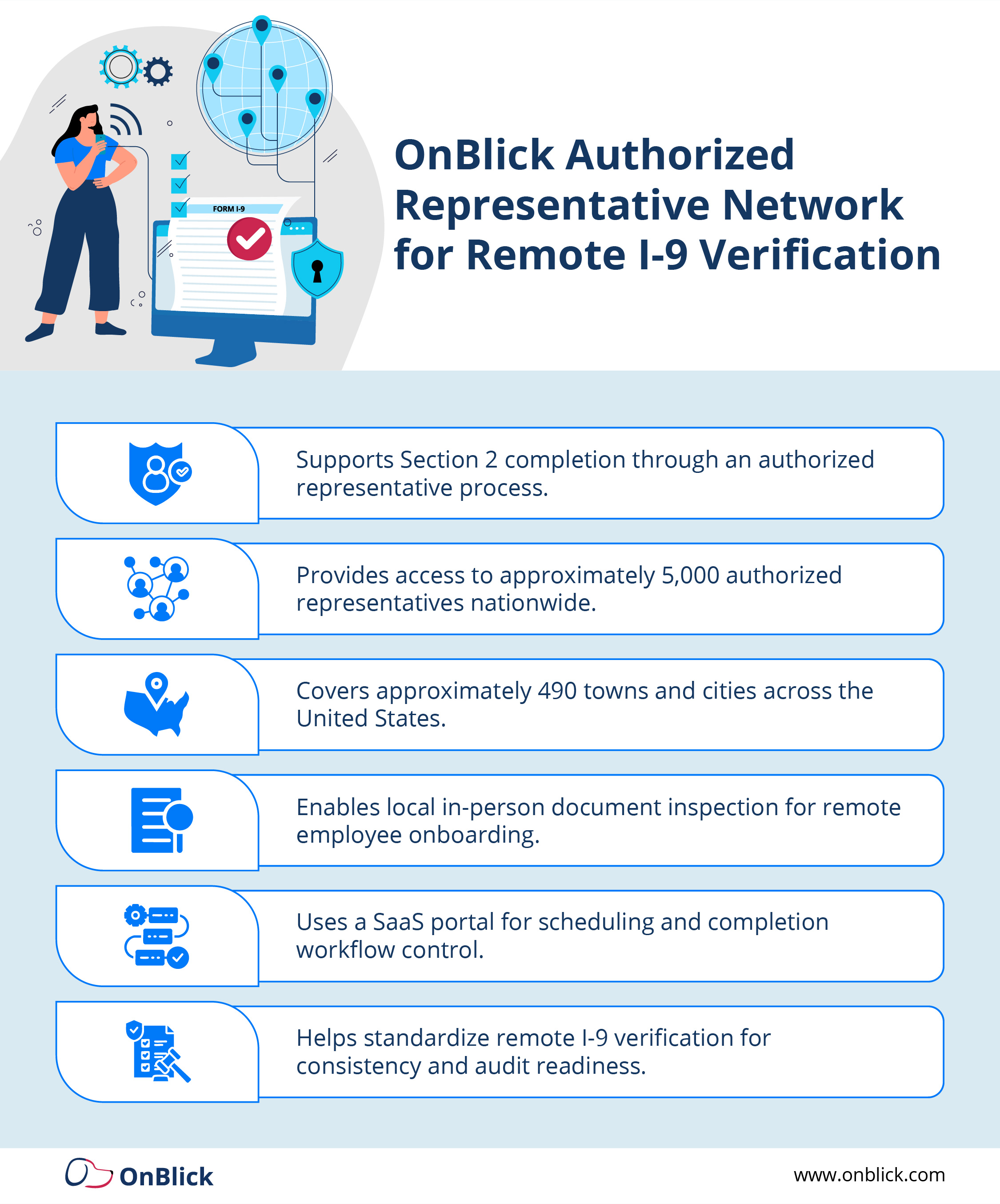 - OnBlick’s Authorized Representative Network helps employers extend consistent, compliant i-9 verification to remote hires across the U.S.